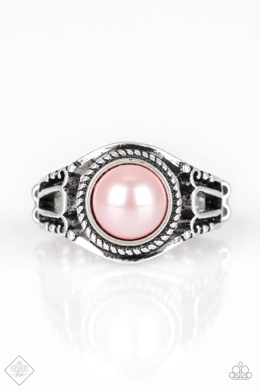 A bubbly pink pearl is pressed into the center of an antiqued silver band rippling with frilly details for a refined look. Features a dainty stretchy band for a flexible fit.