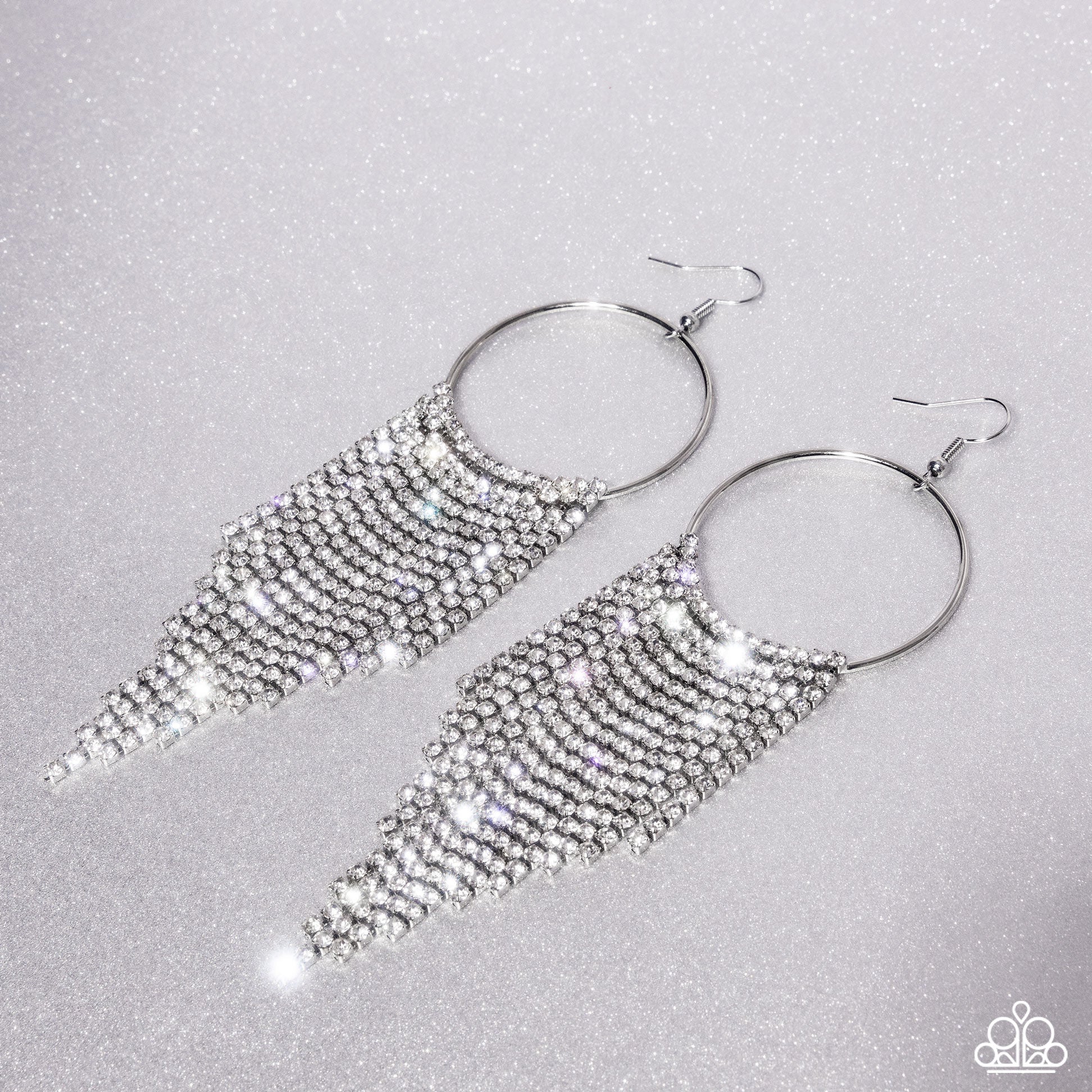 Tapered rows of glittery white rhinestones cascade from the bottom of a shiny silver hoop, creating a glamorously glitzy fringe. Earring attaches to a standard fishhook fitting.