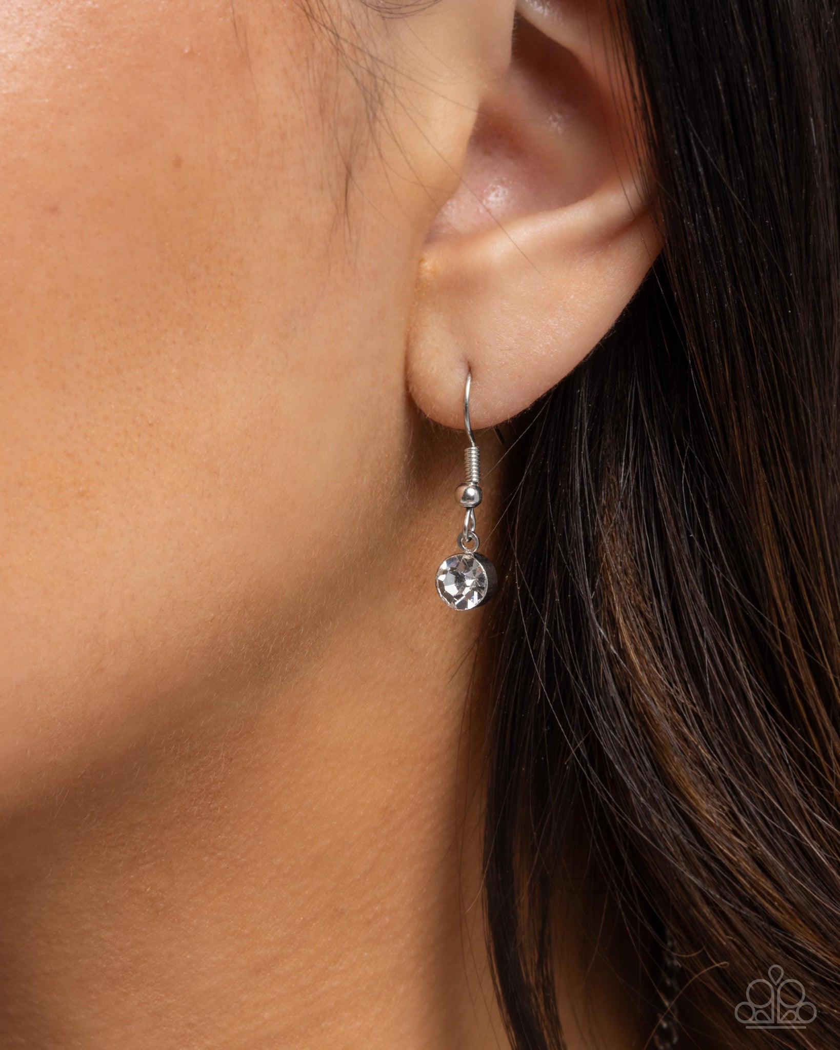 Clusters of glittering white rhinestones are pressed into round silver serrated frames, creating a radiant display along the neckline. A larger rhinestone-encrusted circle swings from the bottom, adding movement and additional sparkle to the design. Features an adjustable clasp closure.