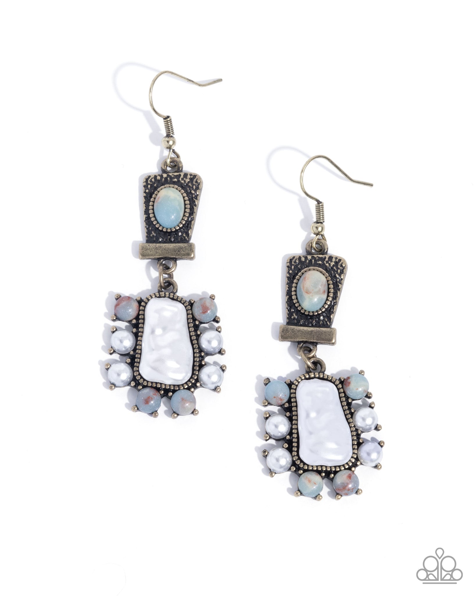 Featuring a hammered rectangular frame, a blue-red marbled oval stone is pressed in its center for an earthy finish. Dangling below sways a baroque pearl-like center surrounded by dainty white pearls and blue-red marbled stones. Earring attaches to a standard fishhook fitting.