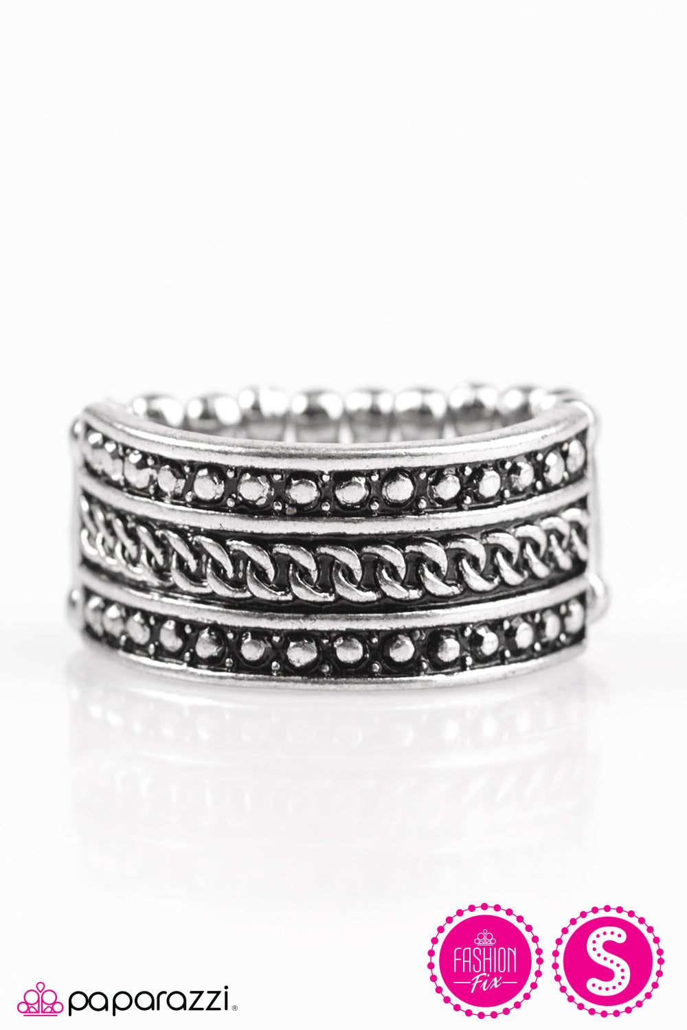 Brushed in an antiqued shimmer, a silver band is embossed in rows of studded and chain-like patterns, creating a collision of texture across the finger.
