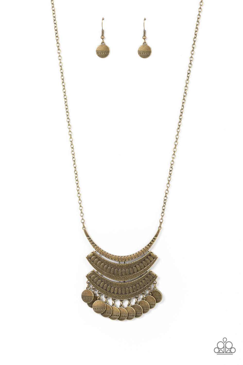 Embossed and stamped with rustic geometric patterns, a single bowing brass bar links with a stack of decorative brass half moon frames at the bottom of an extended brass chain. Stamped with matching texture, antiqued brass discs dance from the bottom of the display for an EMPRESS-ive finish. Features an adjustable clasp closure.