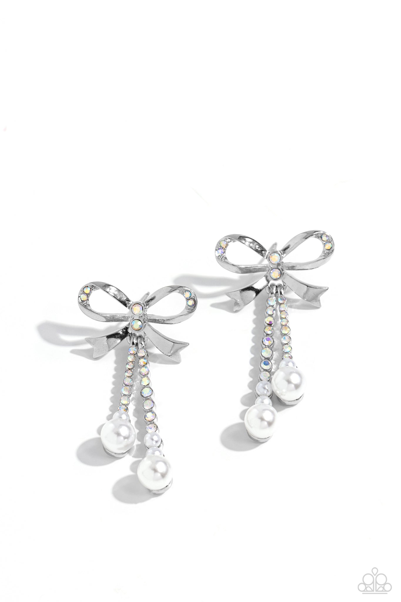 Adorned in sparkling iridescent rhinestones, high-sheen bands of silver curl and loop into a stunning bow charm, creating a classy statement at the ear. Iridescent rhinestones encased in scalloped silver fittings, featuring white pearls that slowly increase in size dangle from the bow charm adding a refined tassel to the stunning display. Earring attaches to a standard post fitting.