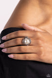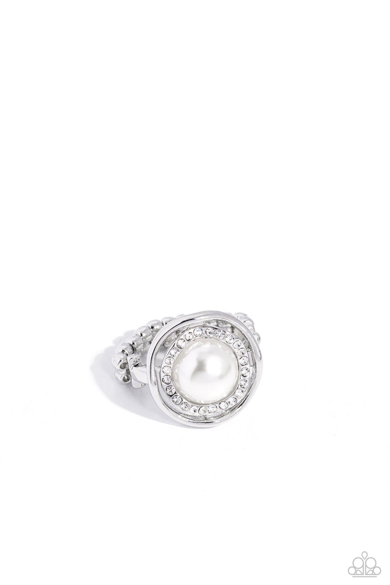 A slightly warped silver hoop encircles a glossy white pearl atop a dainty silver band. A daintier warped silver hoop, encrusted with white rhinestones, curls around the pearl inside the larger silver hoop for a touch of glitz to the sophisticated centerpiece. Features a dainty stretchy band for a flexible fit.