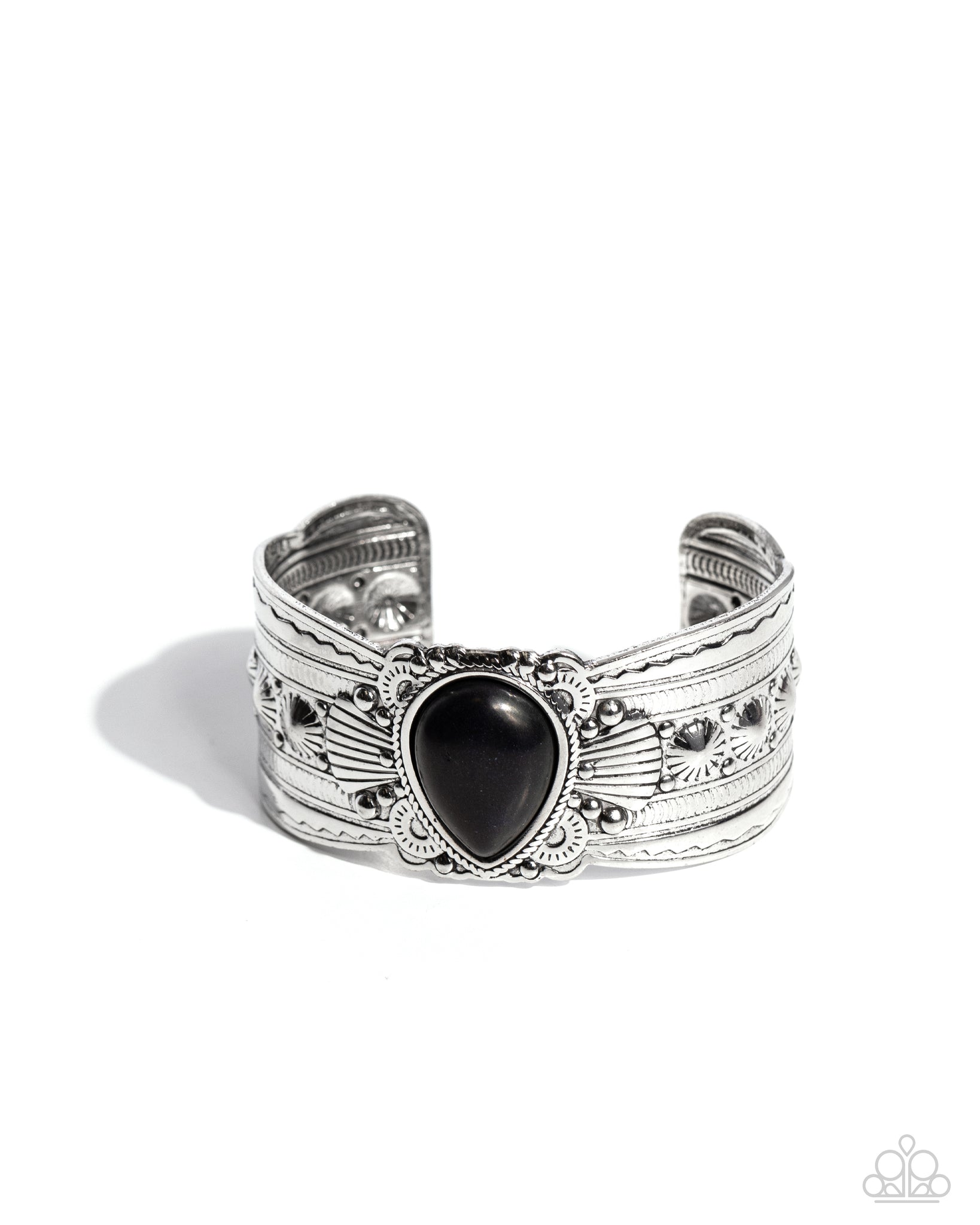 Decorated in artisan inspired patterns and textured studs, the center of a scalloped silver cuff is dotted with an oversized black stone teardrop for an earthy vibe.