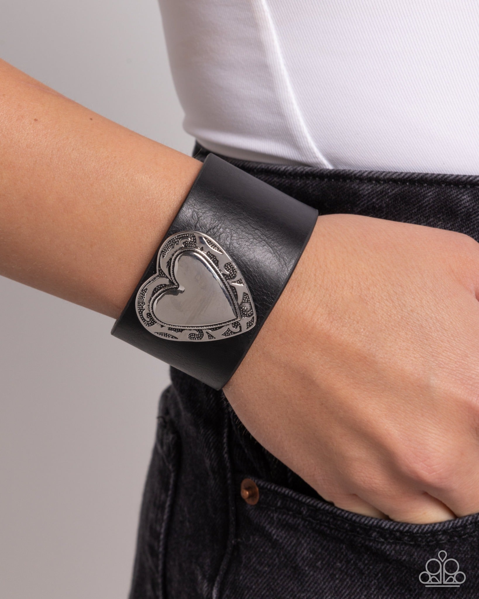 Culminating along the center of a black leather band, a filigree-textured silver heart stands out atop the wrist for a romantically, whimsical fashion. Features an adjustable snap closure.