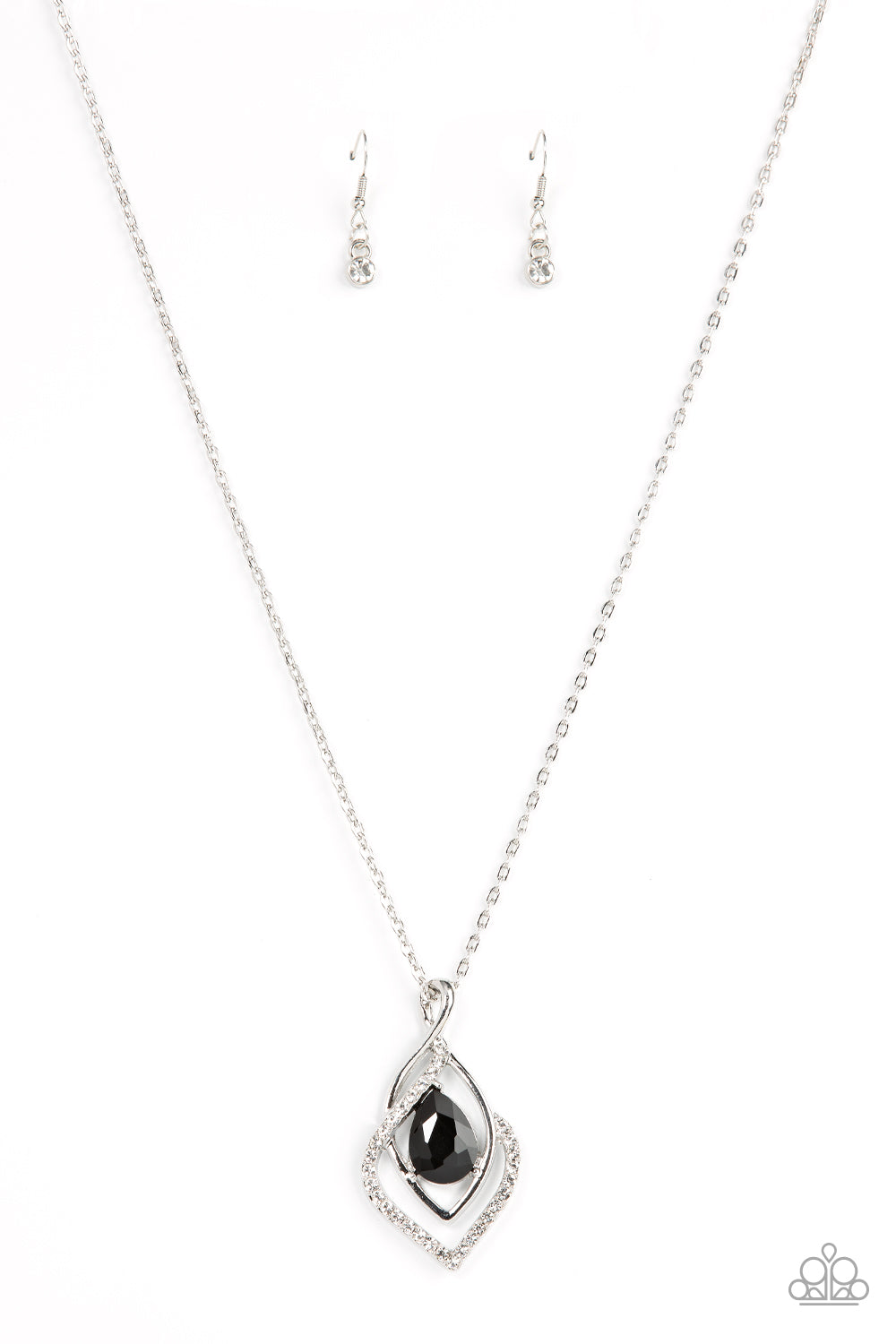 Plain silver and white rhinestone encrusted silver bars asymmetrically swoop and swirl around an oversized black teardrop gem, creating a dazzling pendant at the bottom of a lengthened silver chain. Features an adjustable clasp closure.