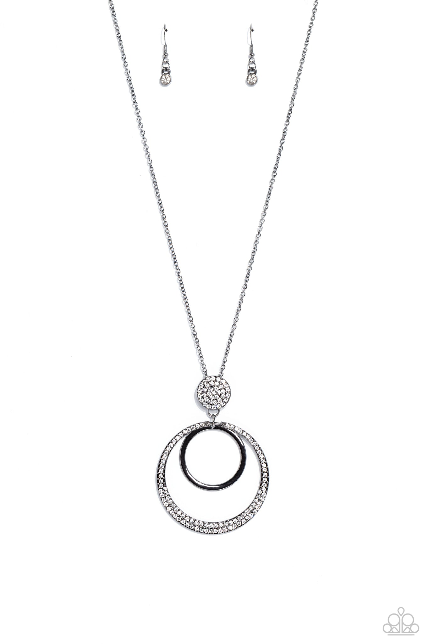 Two rings, one a high-sheen gunmetal, the other, an oversized warped ring embossed with dainty white rhinestones, swing from the bottom of a glistening gunmetal pendant embossed with rhinestones in the same hue, creating a sparkly, stacked pendant. The glittery display falls from an elongated, classic gunmetal chain, lengthening the torso. Features an adjustable clasp closure.