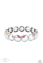 Faceted iridescent gems are pressed into sleek silver frames. The glittery frames are threaded along stretchy bands, creating a glamorous look around the wrist.