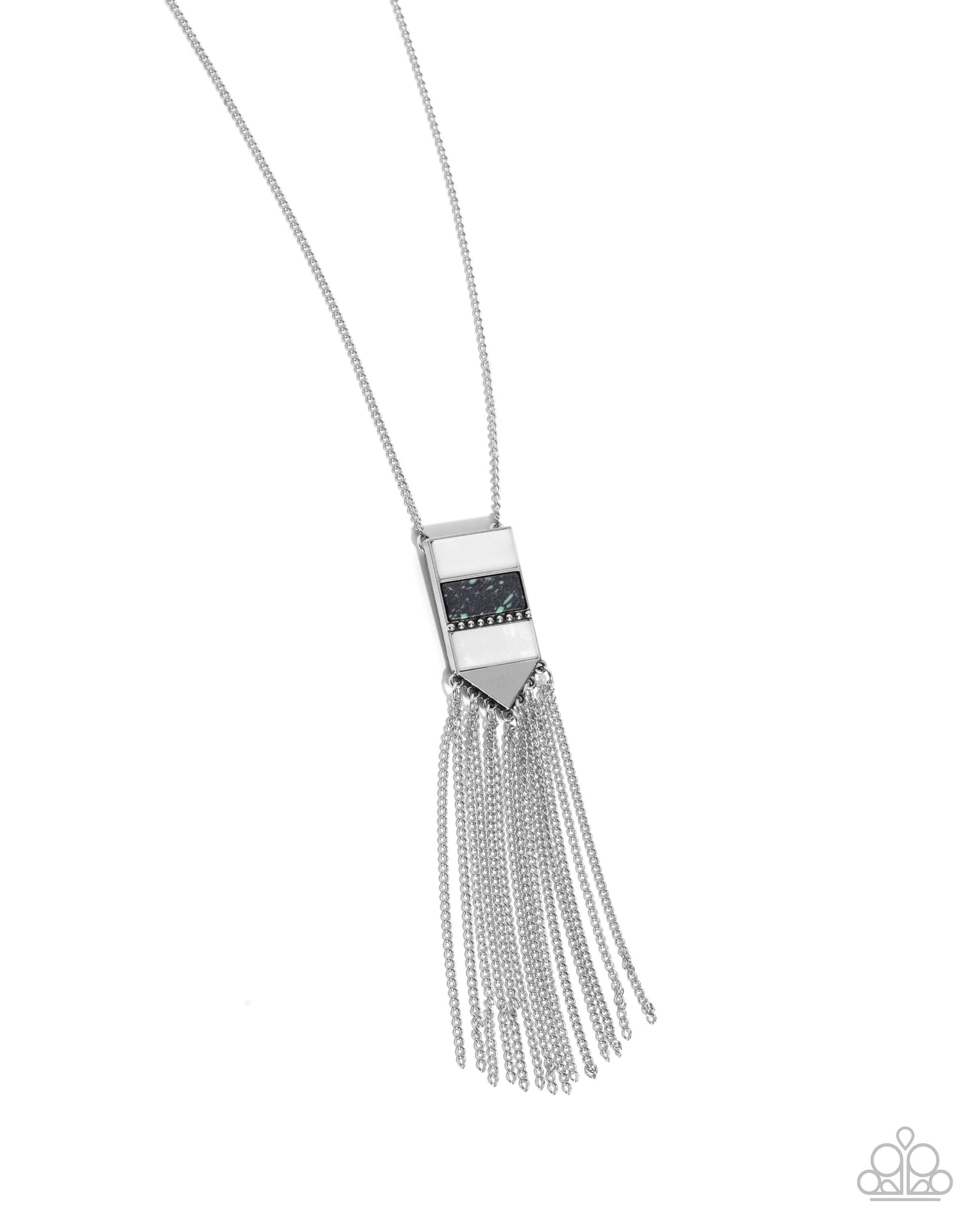 Pressed in a shield-like pendant, rectangular white shells, a black-and-green-spotted stone, a row of silver studs, and a silver triangle gather along an extended silver chain creating a trendy art deco-inspired pendant. A tapered display of classic silver chains streams from the bottom of the pendant adding an eye-catching handcrafted finish. Features an adjustable clasp closure. As the stone elements in this piece are natural, some color variation is normal.