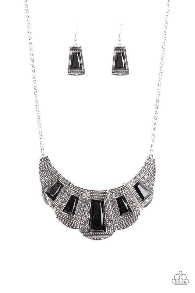 Featuring faceted emerald style cuts, bold geometric black beads are pressed into studded silver frames that dramatically link below the collar for a fierce finish. Features an adjustable clasp closure.