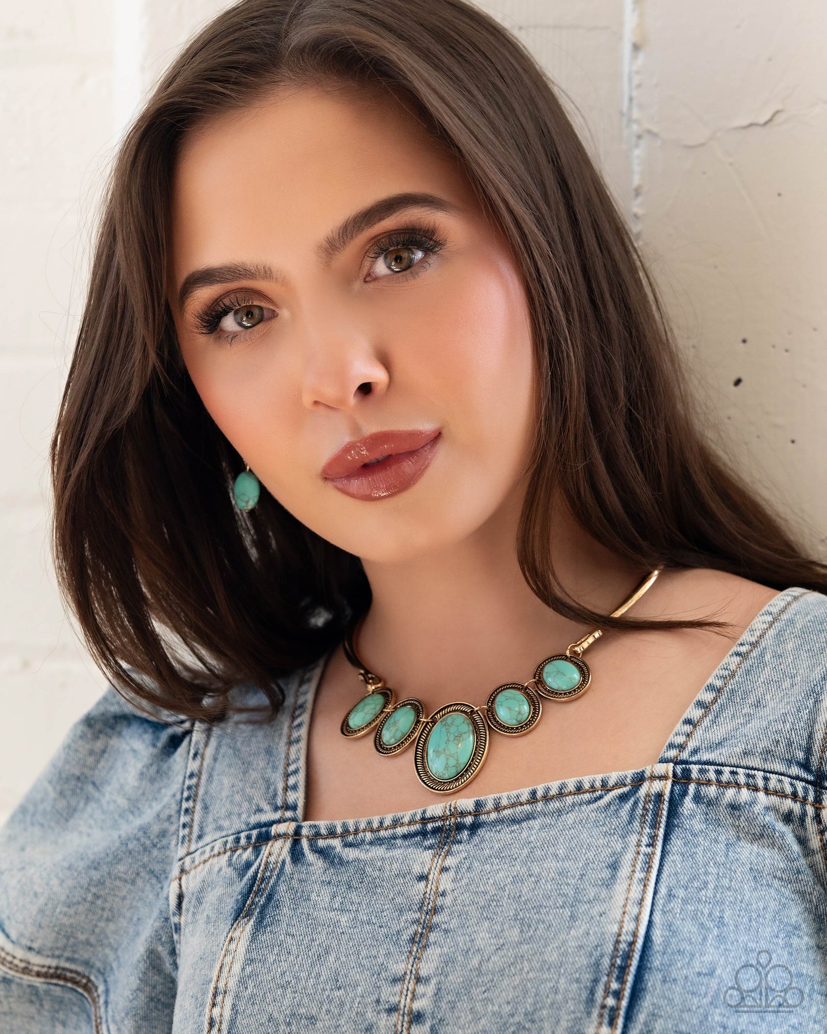 Two antiqued gold bars curl around the neck as they give way to a row of refreshing turquoise stones that falls delicately below the collar. Each stone is encased in a textured gold frame, adding a traditional artisanal flair to each unique pendant. Features an adjustable clasp closure.