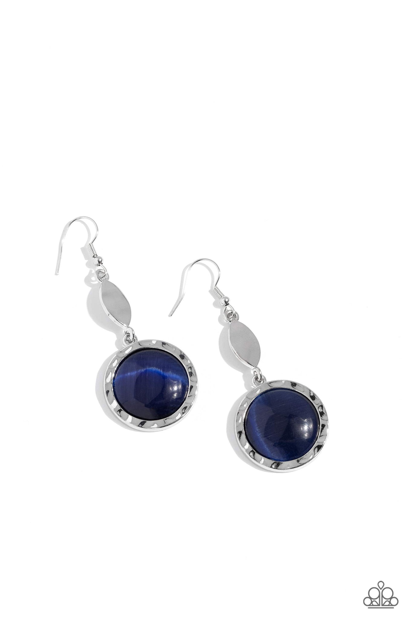 Encased in a hammered silver frame, an oversized blue cat's eye stone swings from the bottom of a hammered silver marquise shaped frame for a magically whimsical look. Earring attaches to a standard fishhook fitting.