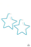 A thin, oversized blue metallic bar delicately folds into a star-shaped hoop, resulting in a stellar statement. Earring attaches to a standard post fitting.