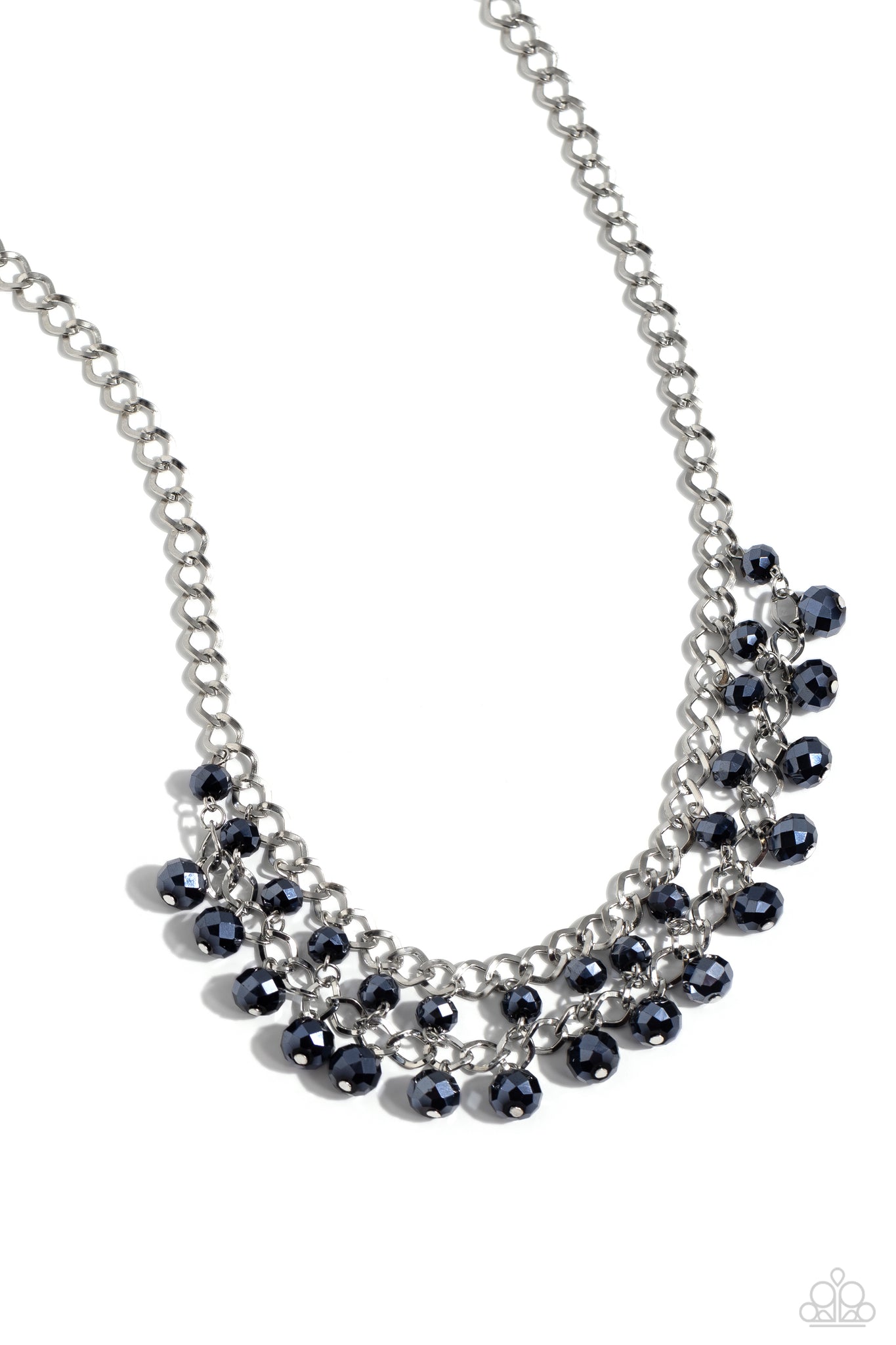 Featuring metallic iridescence, two rows of flashy blue crystal-like beads cascade from the bottom of two interlocking silver chains, resulting in a radiant fringe below the collar. Features an adjustable clasp closure.