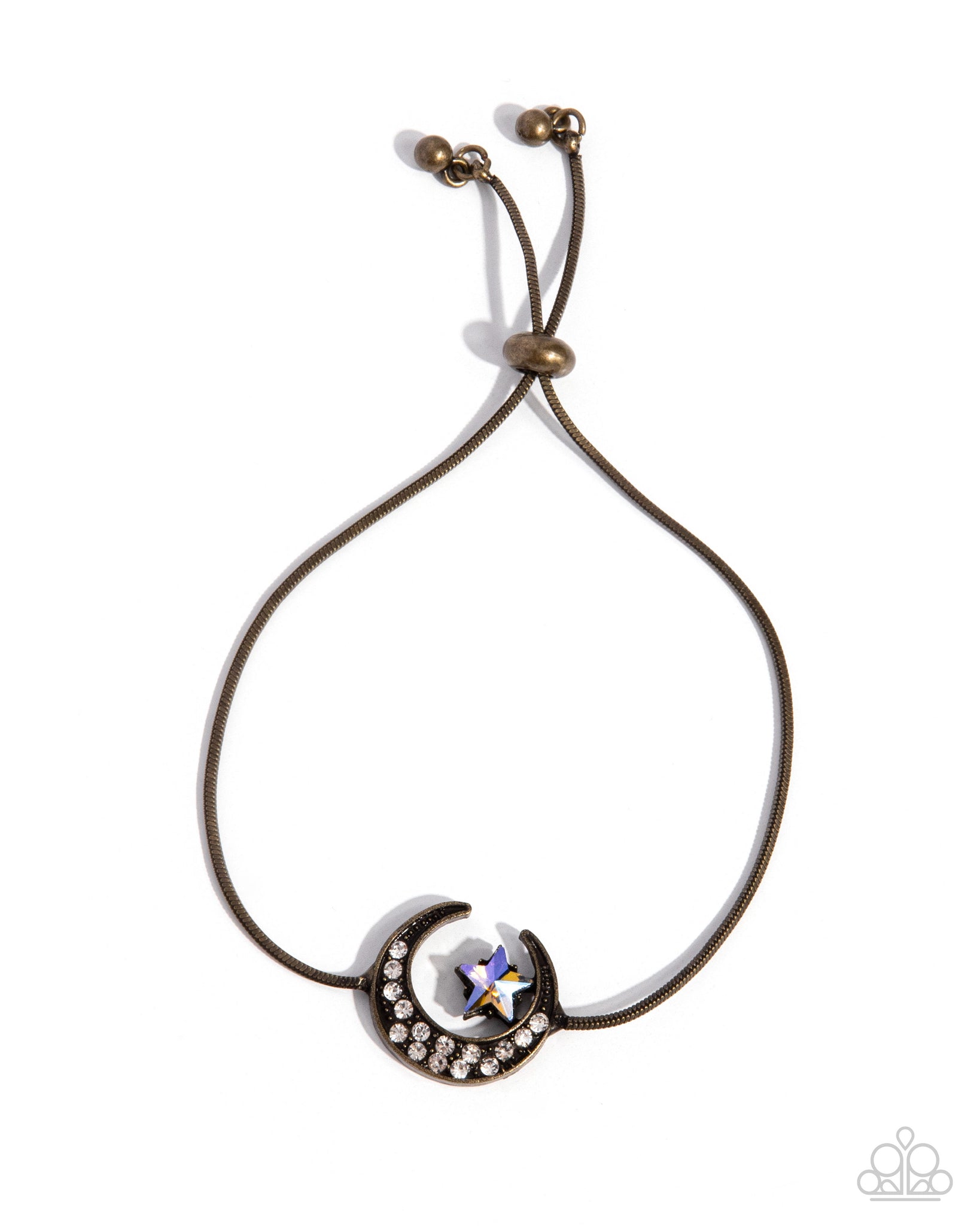 Featured in the center of a brass snake chain, a tilted brass crescent moon is dusted in glistening white rhinestones and brass studs. A UV shimmery star is pronged and suspended along the lower curve of the crescent moon for a pop of cosmic color. Features an adjustable sliding brass bead closure.