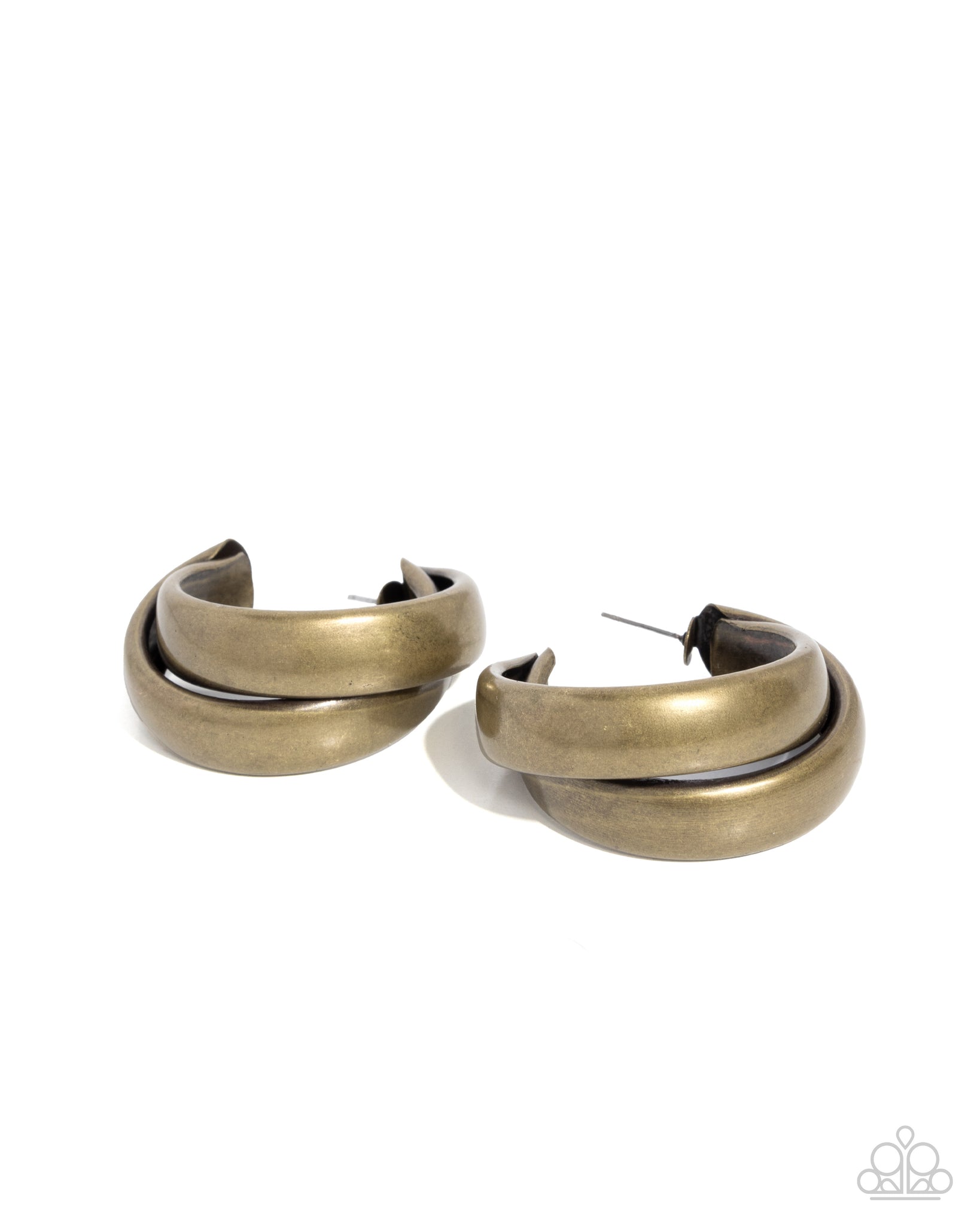 Polished brass hoops are artfully twisted into a bold, layered design, creating a striking statement piece. The sleek and reflective surface enhances the contemporary aesthetic, adding a modern look to any outfit. Earring attaches to a standard post fitting. Hoop measures approximately 1 3/4" in diameter.