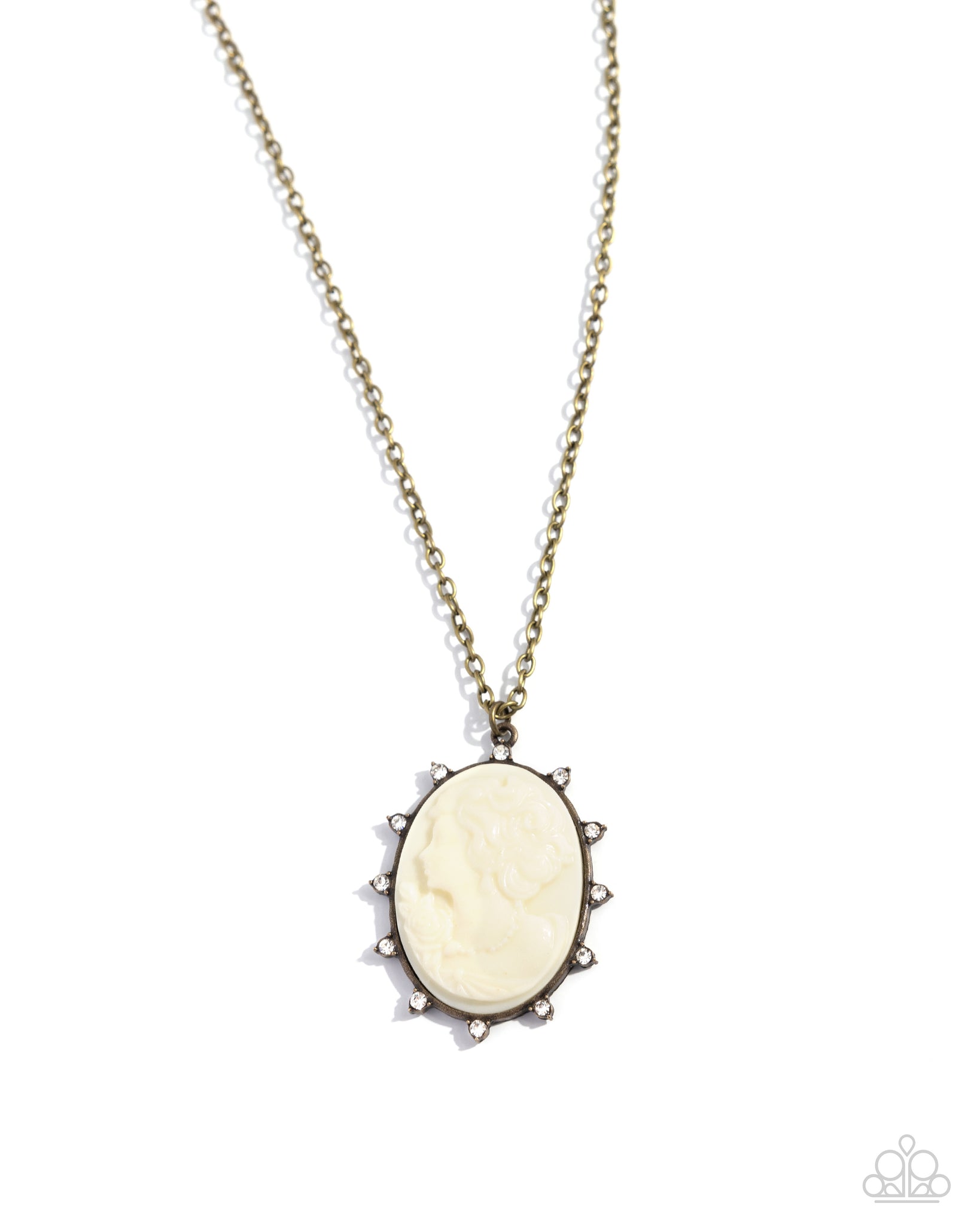 Featuring an off-white vintage-embellished oval pendant, a collection of dainty white rhinestones in pronged brass fittings encircle the pendant, further highlighting the detail of the ladylike pendant. Features an adjustable clasp closure.