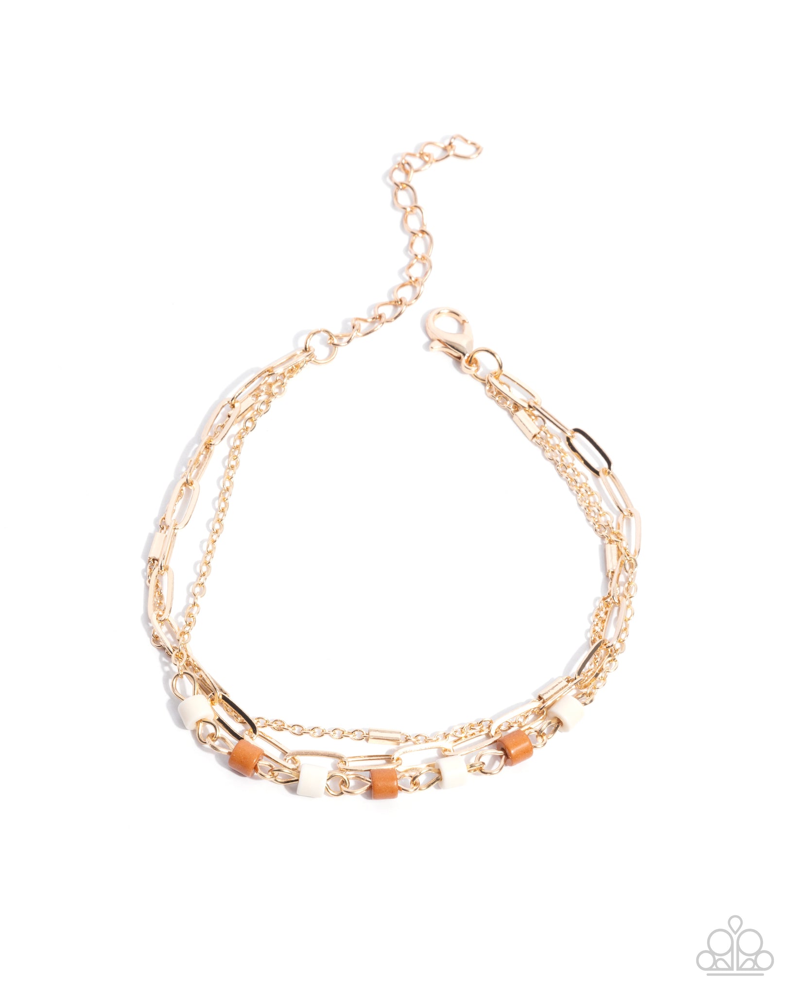 A quartet of mismatched gold chains, including dainty, abstract, paperclip, and dainty box chains layer around the wrist to create a refined display. Adorning the dainty uppermost strand, thin gold cylinder beads join white shell discs and Buckthorn Brown stone discs that alternate and are infused along the abstract gold chain for a blend of badlands-inspired color and attitude. Features an adjustable clasp closure. As the stone elements in this piece are natural, some color variation is normal.