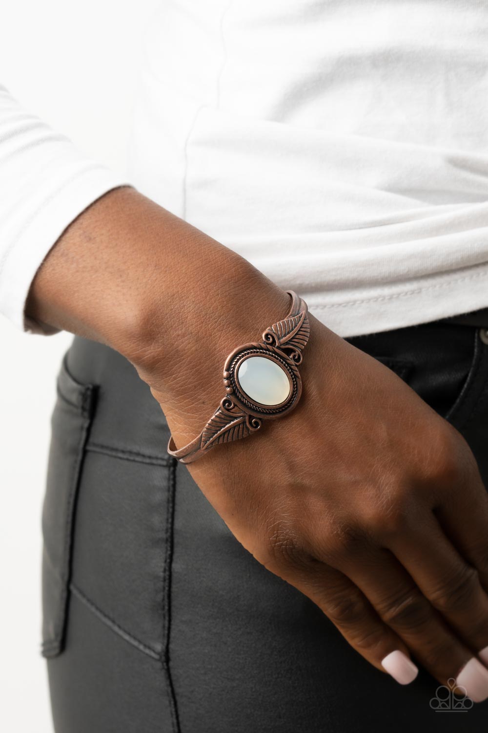 An opal white bead is pressed into the center of a studded and textured copper frame atop a dainty brass cuff. Two copper feathery leaf frames fan out from the mystical center, resulting in a serendipitous centerpiece around the wrist.