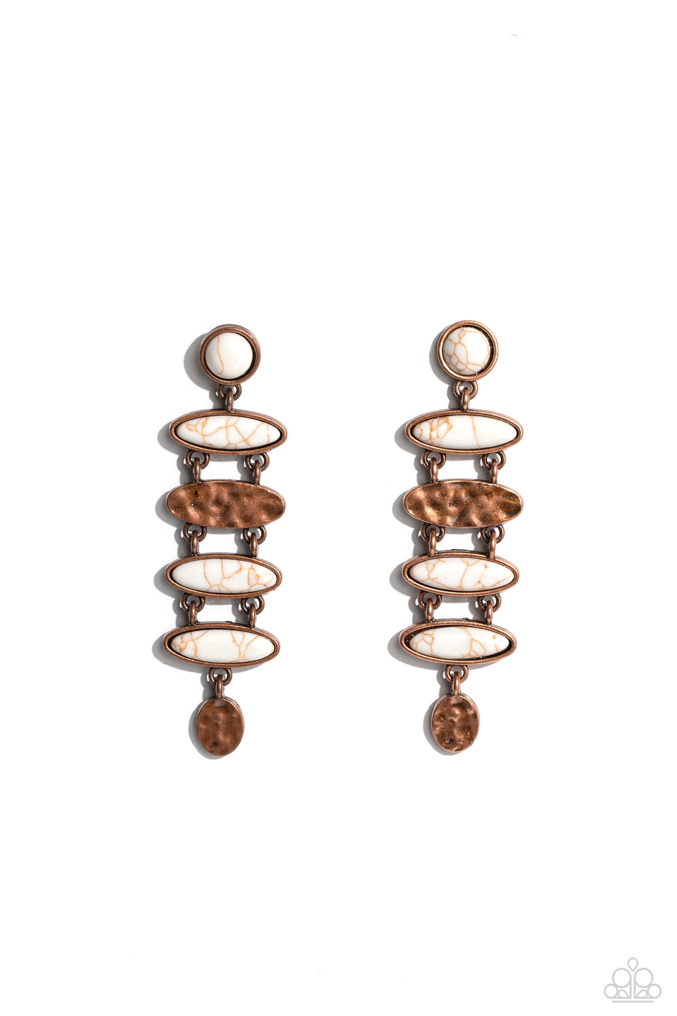 Round and oblong white stone adorned copper frames link with hammered copper accents, resulting in a rustically earthy lure. Earring attaches to a standard post fitting.