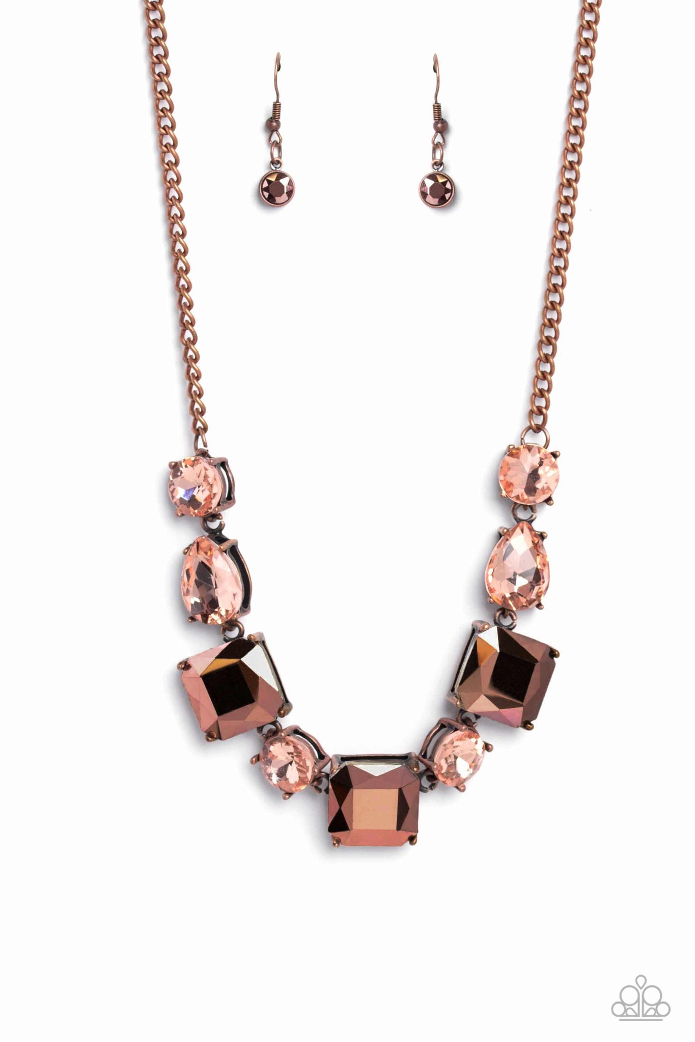 Encased within thick, pronged, elevated copper settings, a geometric collection of metallic copper and peachy rhinestones, featured in square, teardrop, and round shapes coalesces down the neckline for a gritty, yet glamorous display. Features an adjustable clasp closure.