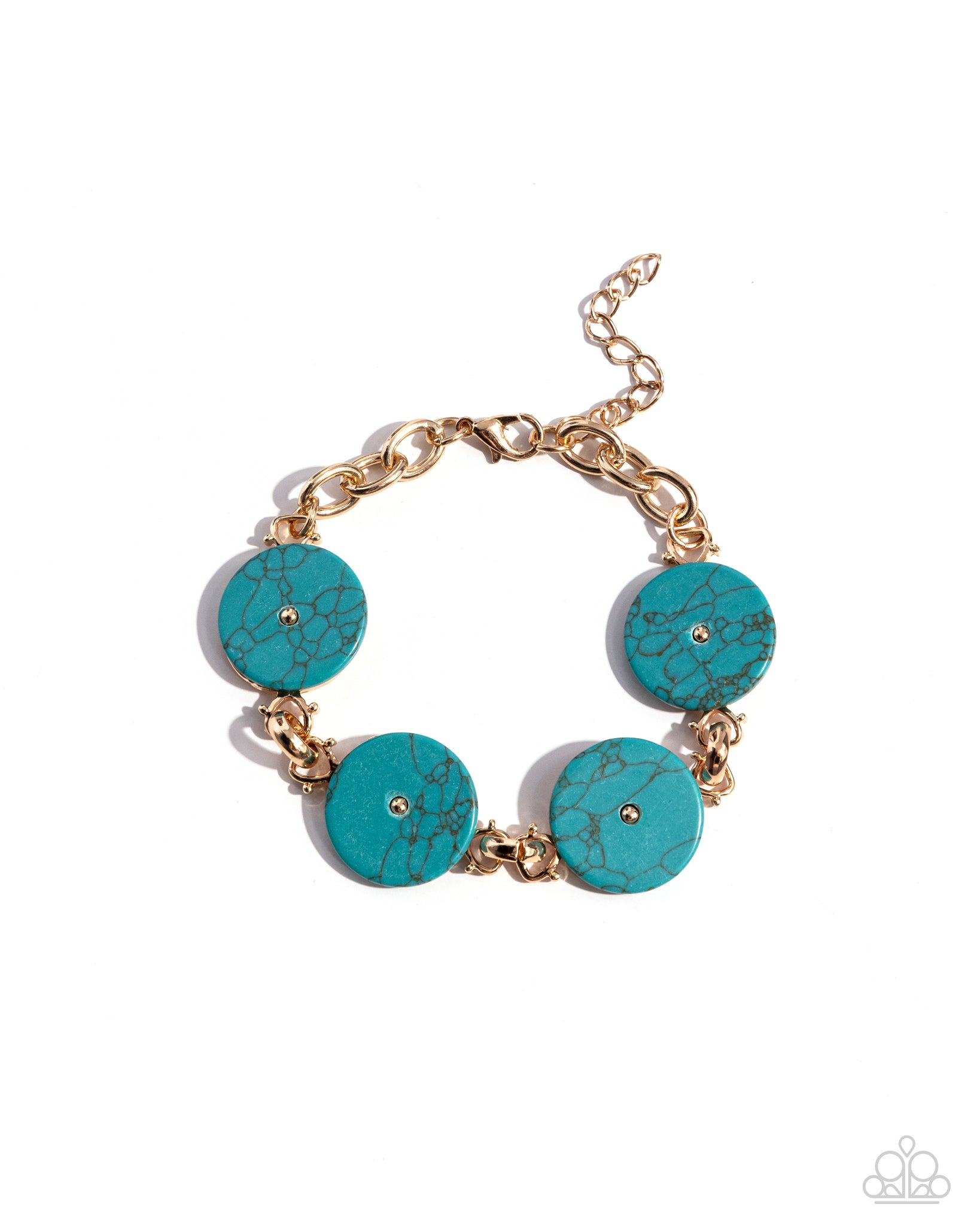Infused along a strand of gold cable chain, a collection of marbled turquoise stone pendants with gold-beaded centers wraps around the wrist, creating a contrasting blend of rustic elegance. Features an adjustable clasp closure. As the stone elements in this piece are natural, some color variation is normal.