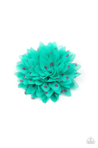 Dotted in purple polka dots, folds of green chiffon petals gather into a bustling blossom for a playful look. Features a standard hair clip on the back.