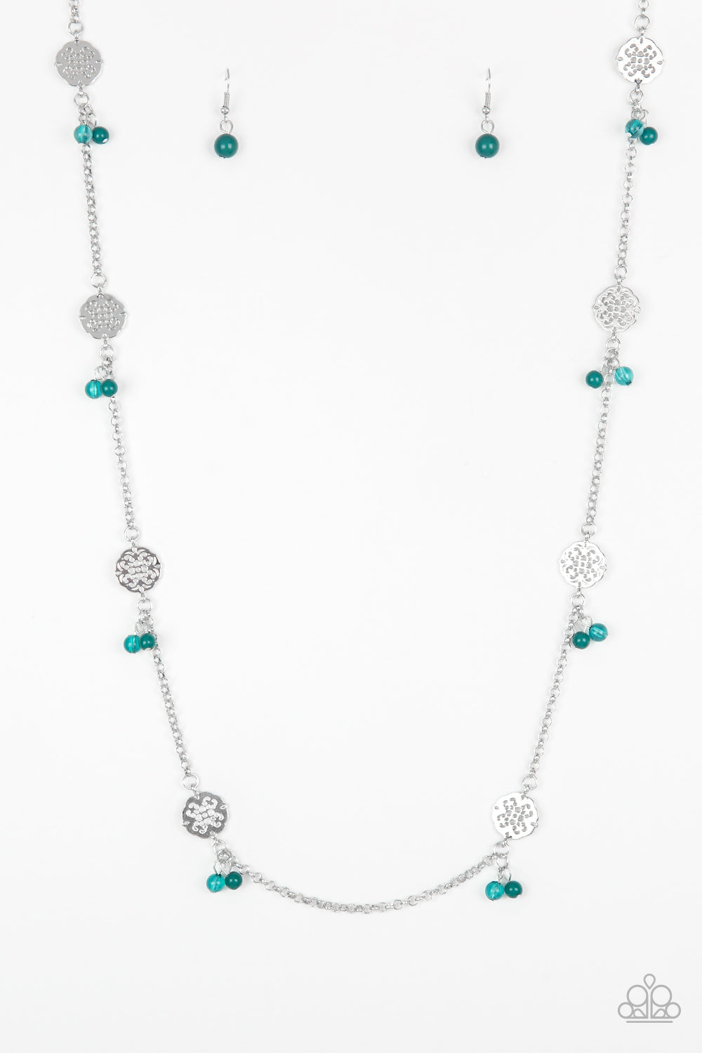 Featuring glassy and polished finishes, dainty green beads join ornate silver frames along a shimmery silver chain for a whimsical look. Features an adjustable clasp closure.