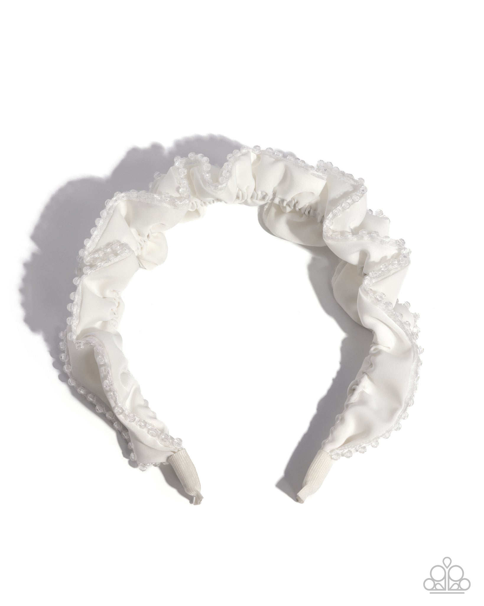 A crinkled, white, oversized ribbon lined with faceted crystal-like white beads atop its top and bottom frame curls atop the head, evoking an eye-catching elegant look.