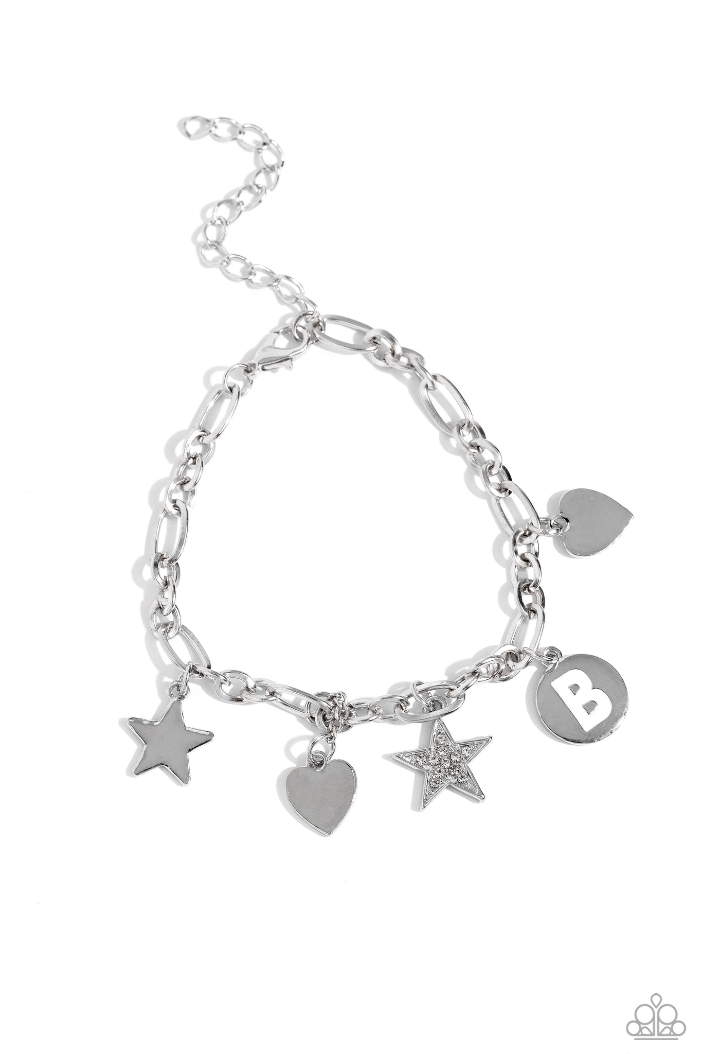 A strand of silver chain is decorated with sentimental charms, including a white rhinestone-encrusted and sleek silver star, a hammered and sleek silver heart, and a white-painted "B" silver pendant for a charismatic display around the wrist. Features an adjustable clasp closure.
