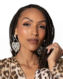 Suspended from white rhinestones in silver square fittings, an oversized silver heart silhouette features an explosion of white round, teardrop, and marquise-cut gems that glisten from a solitaire white gem teardrop fitting for a generously glittery display. Earring attaches to a standard post fitting.