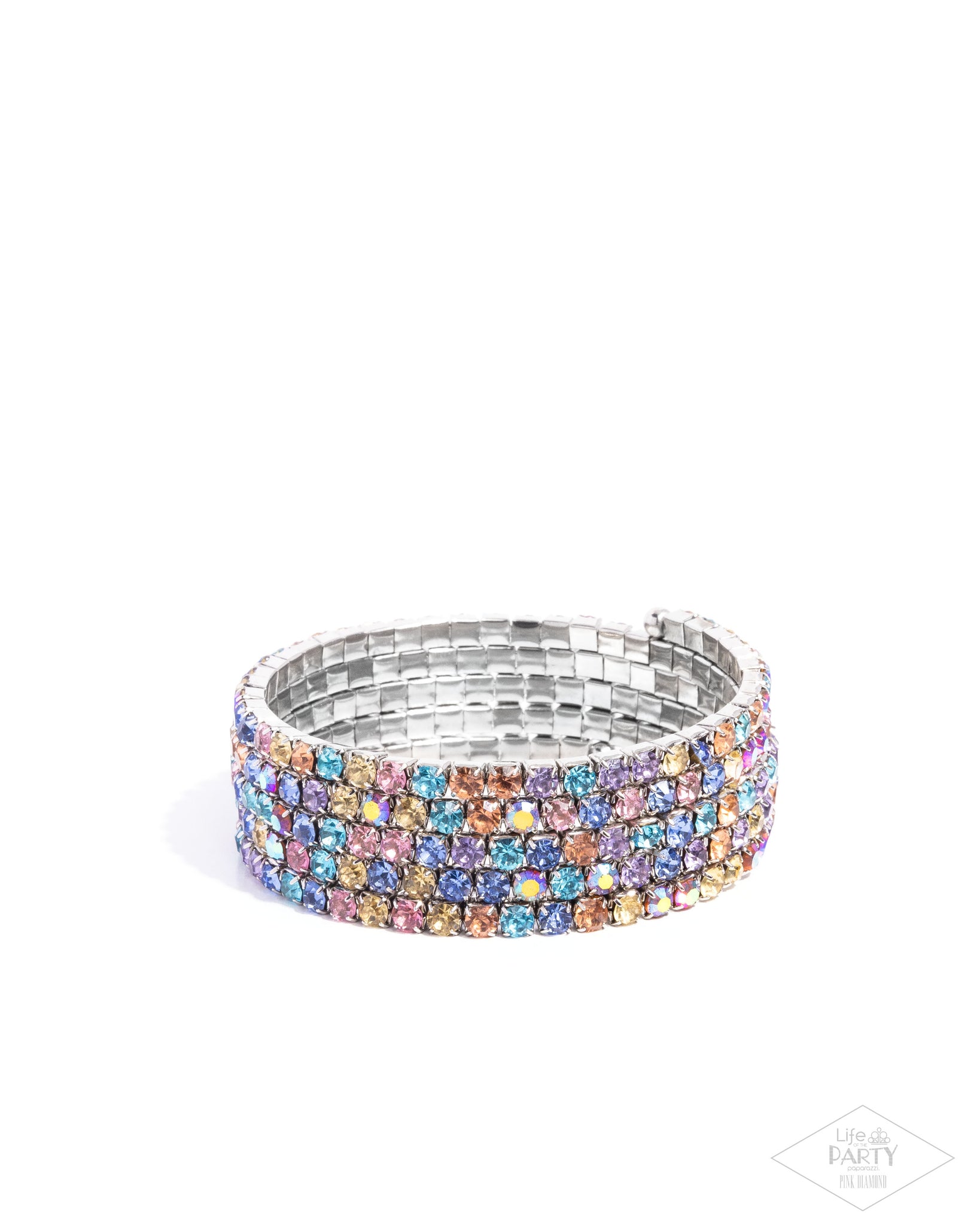 Encased in sleek silver fittings, row after row of glassy multicolored and iridescent rhinestones coil around the wrist, creating a blinding infinity wrap bracelet. Due to its prismatic palette, color may vary.