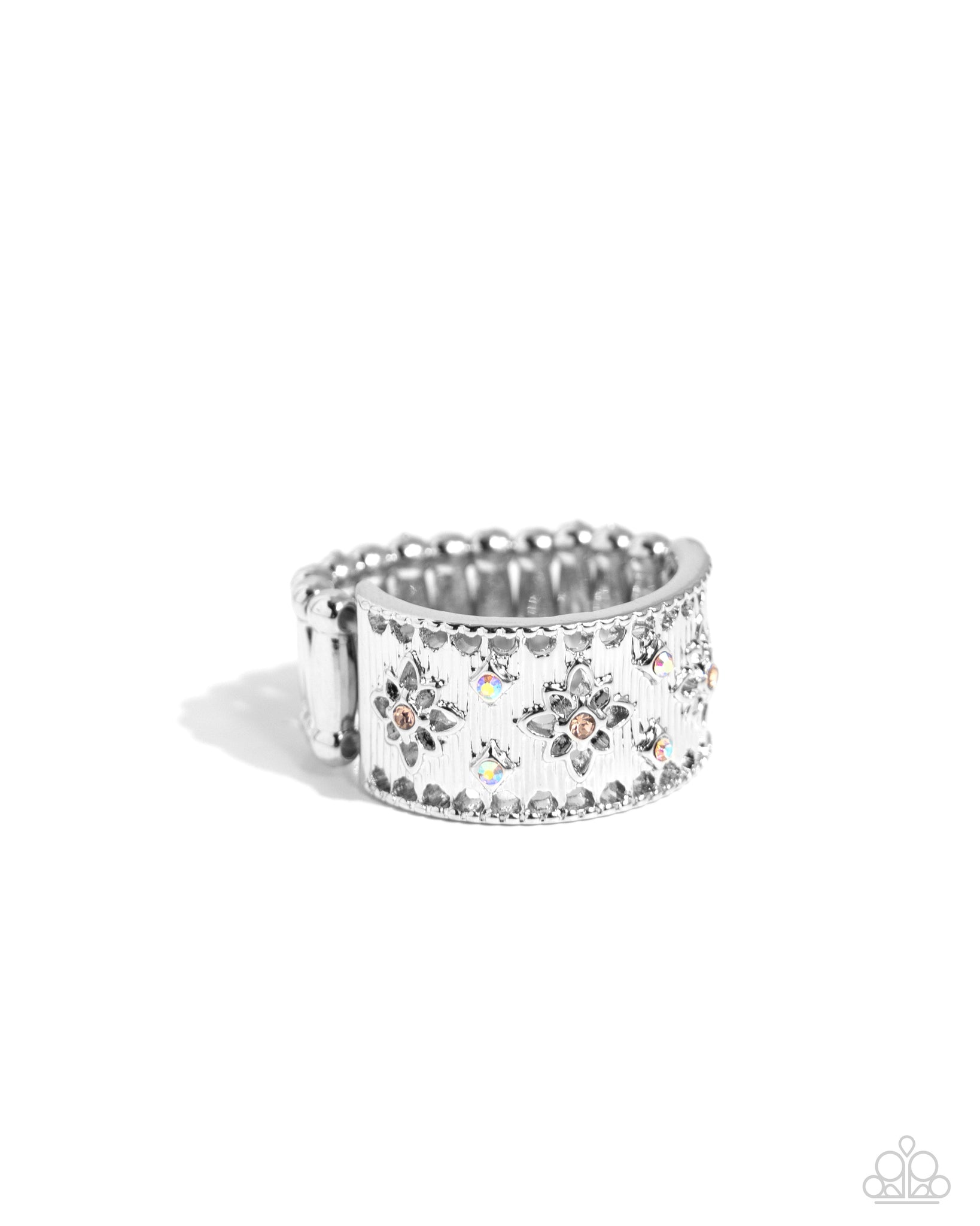 Patterned across a textured, airy silver band, a collection of diamond and floral cut-outs with peach and peach iridescent rhinestone centers glitter atop the finger for a whimsical centerpiece. Features a stretchy band for a flexible fit. Due to its prismatic palette, color may vary.