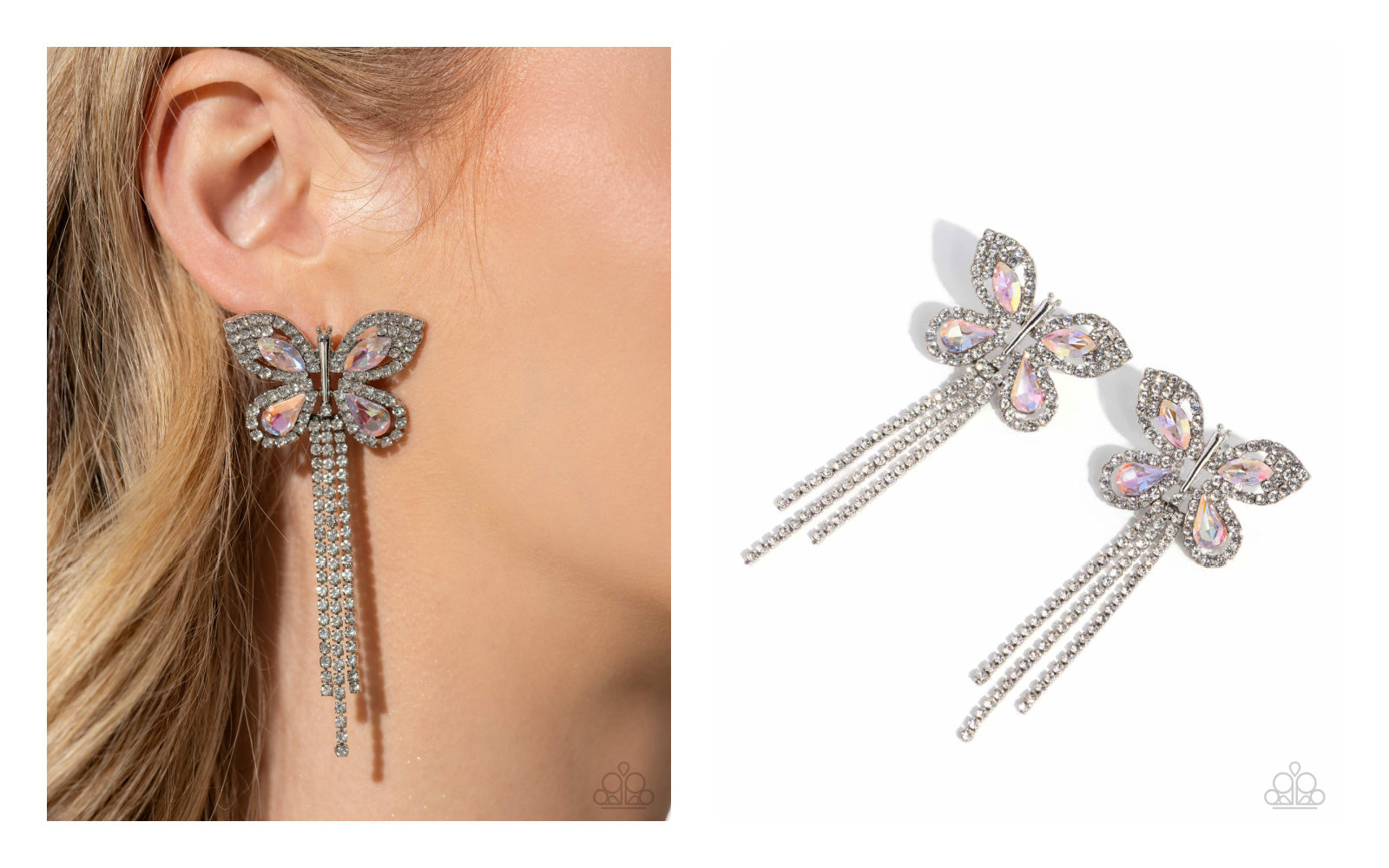Bordered by glistening white rhinestones, an airy pink UV gem butterfly flutters along the ear. Staggered rows of white rhinestones pressed in delicate silver fittings cascade from the sparkly centerpiece, seemingly lifting the butterfly off to its glitzy flight. Earring attaches to a standard post fitting.