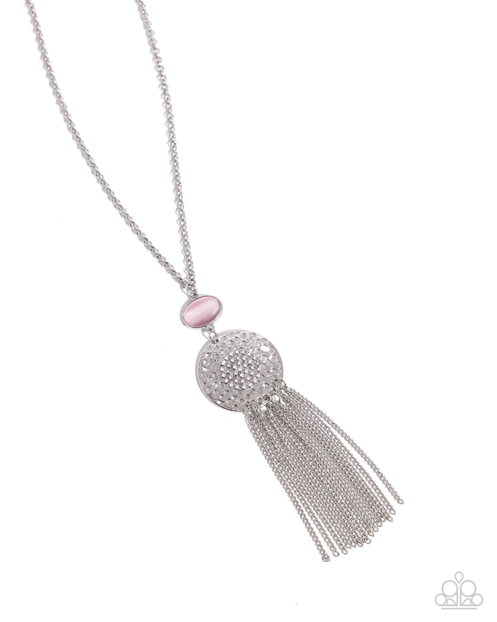 Dainty white rhinestones are sprinkled across the center of a silver disc featuring abstract circular cutouts. Infused with a shimmery silver chain tassel, the airy silver medallion is suspended from a glassy pink cat's eye frame at the bottom of an extended silver chain for a whimsical finish. Features an adjustable clasp closure.
