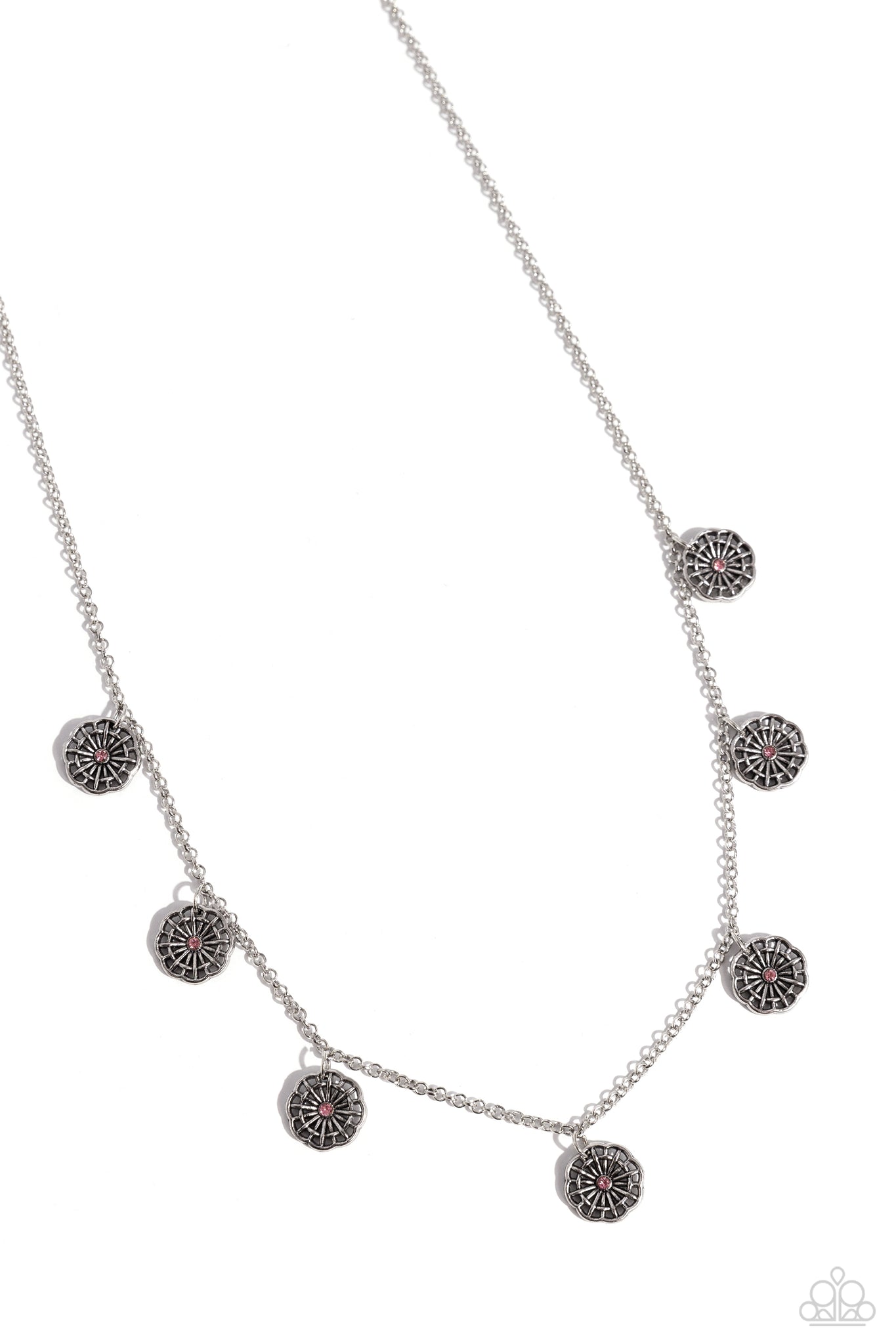 Whimsical antiqued silver floral medallions, dotted with dainty light rose rhinestone centers, dangle from a petite silver chain resulting in a charming allure below the collar. Features an adjustable clasp closure.