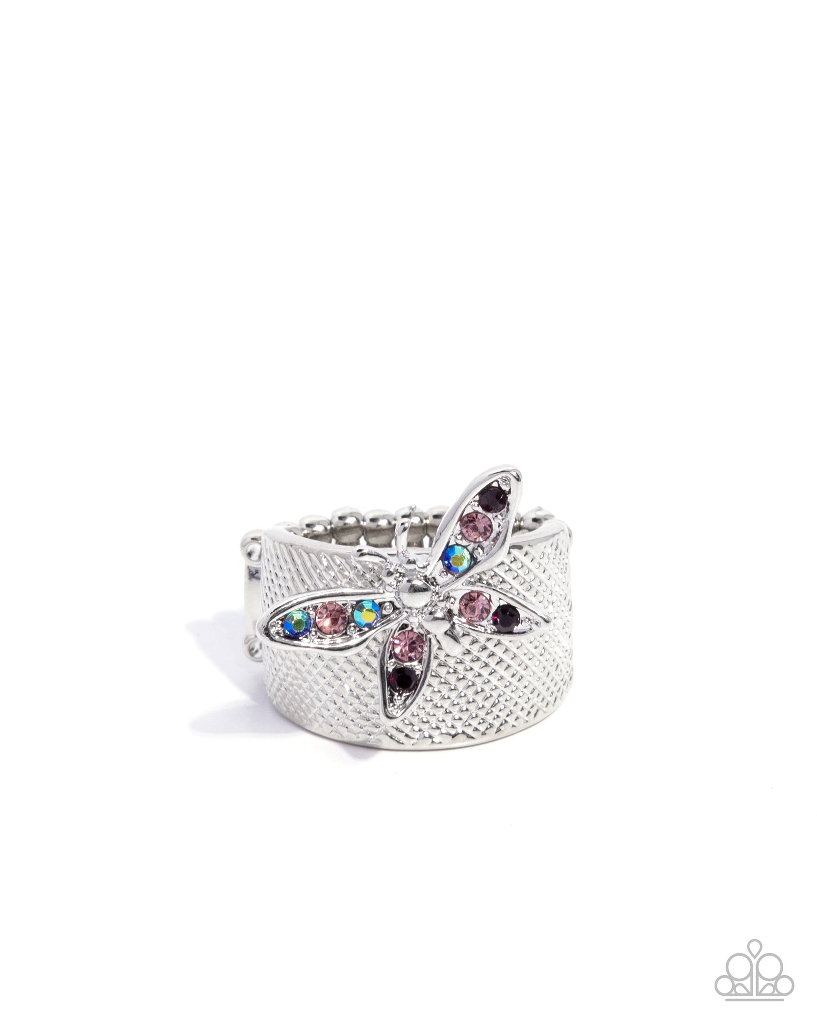 Brushed in a crosshatched texture, a wide silver band showcases a whimsical butterfly encrusted in a mix of light amethyst, amethyst, and iridescent rhinestones. The fluttering centerpiece adds a playful splash of sparkle atop the finger. Features a stretchy band for a flexible fit. Due to its prismatic palette, color may vary.