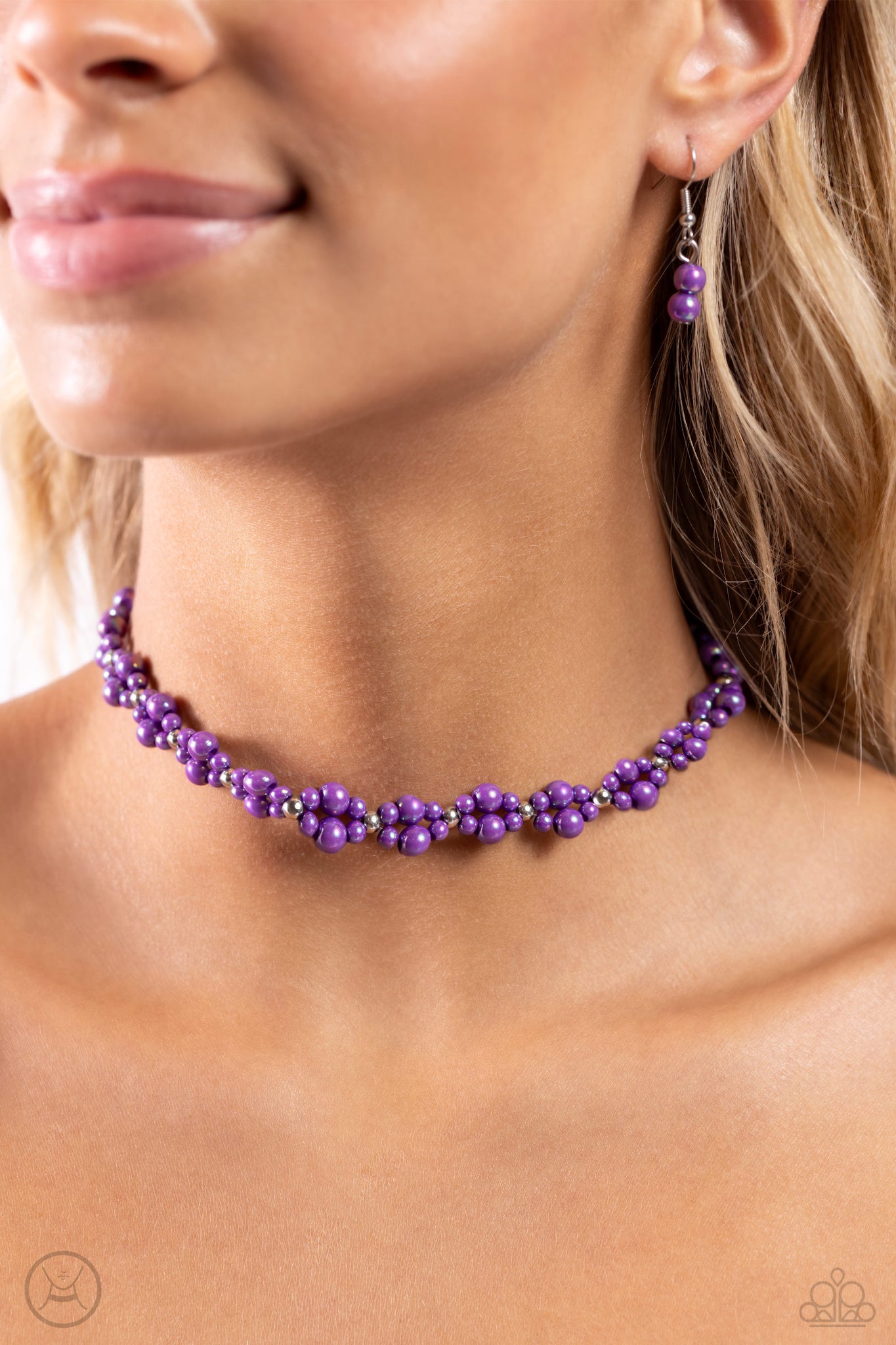 Dipped in an iridescent finish, varying sizes of purple pearls cluster around the neckline in a dreamy pop of color. Dainty silver beads alternate along the collar and pearly clusters for a touch of industrial shimmer. Features an adjustable clasp closure. Due to its prismatic palette, color may vary.