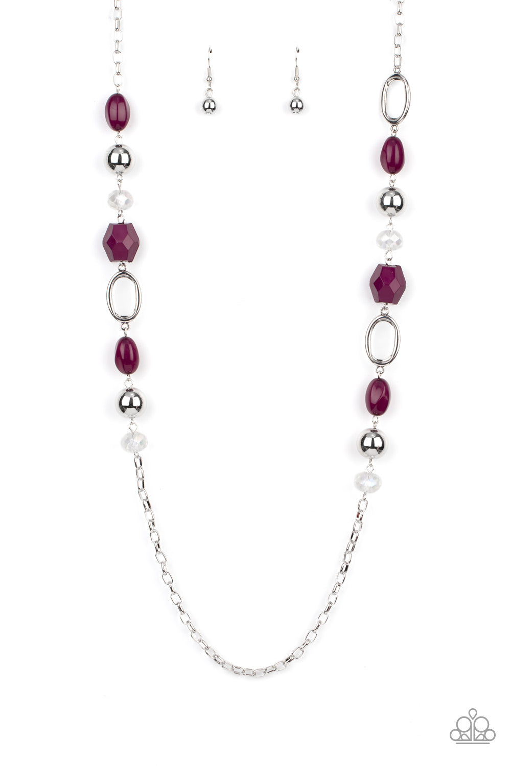 Featuring smooth, faceted, and polished finishes, a mismatched assortment of classic silver beads, sparkly crystal-like accents, silver ovals, and oversized plum beads connect with sections of silver chain across the chest for a flirtatious splash of color. Features an adjustable clasp closure.