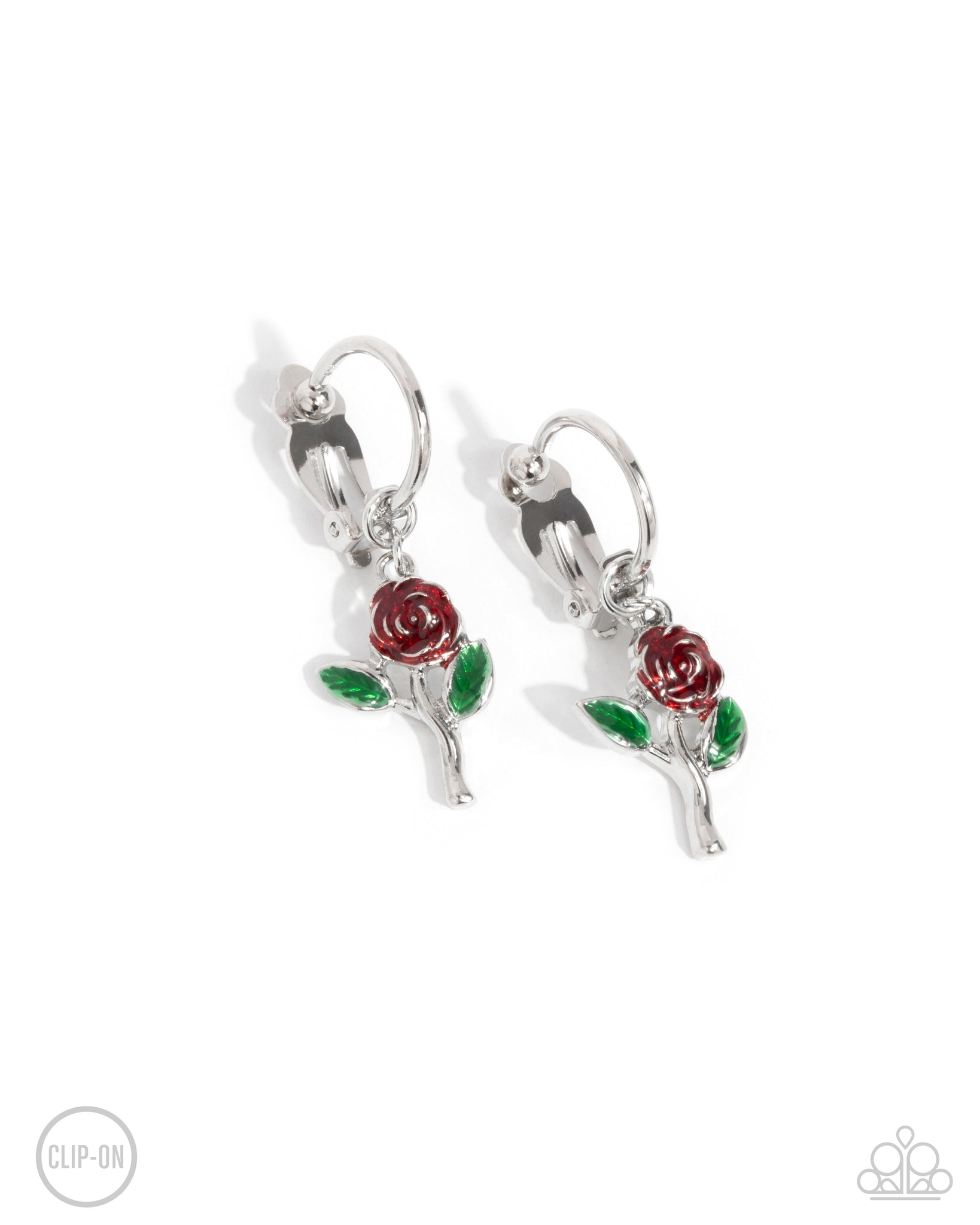 Featuring red and green paint, a glistening silver rose stem glides along a silver hoop for a whimsical look. Earring attaches to a standard clip-on fitting.