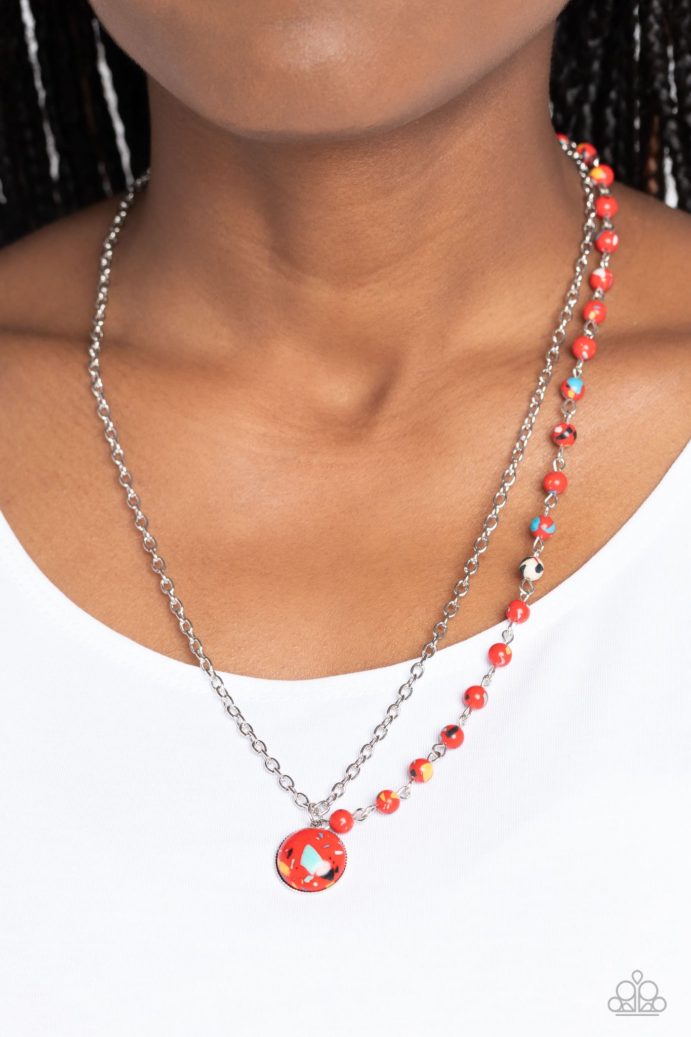 Dangling from a classic silver chain, a red stone, spotted with multicolored specks rests below the collar. A silver chain, infused with stony beads in the same red, spotted hue adds further earthiness to the design. Features an adjustable clasp closure. As the stone elements in this piece are natural, some color variation is normal.