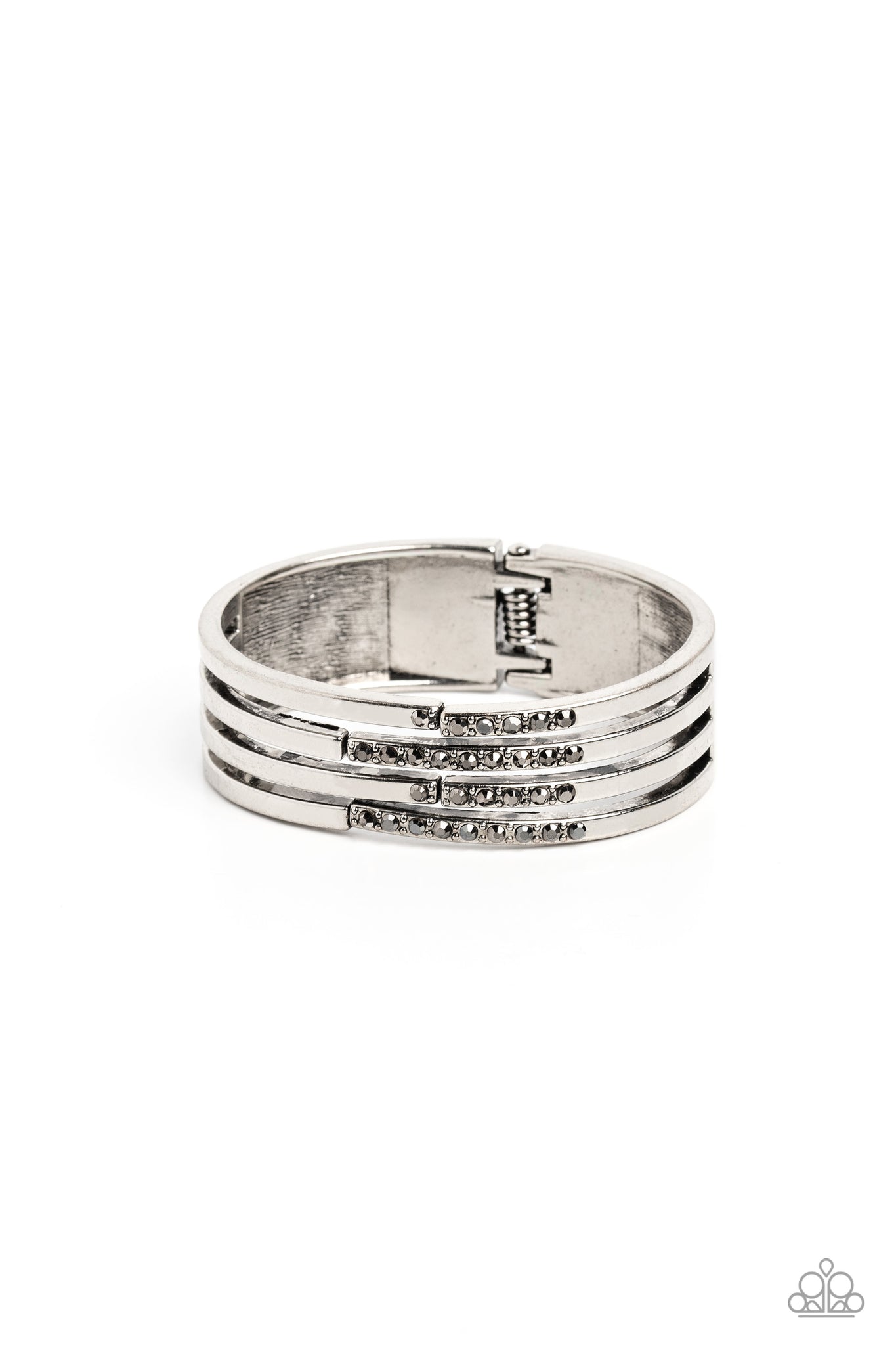 Linear layers of silver stream from a solid piece of silver for an industrial vibe. Featured on the various streams of silver bars, hematite gems and silver studs coalesce across the surface for a subtle pop of shimmer atop the wrist. The skin peeks out from the scattered bars for additional eye-catching detail. Features a hinged closure.
