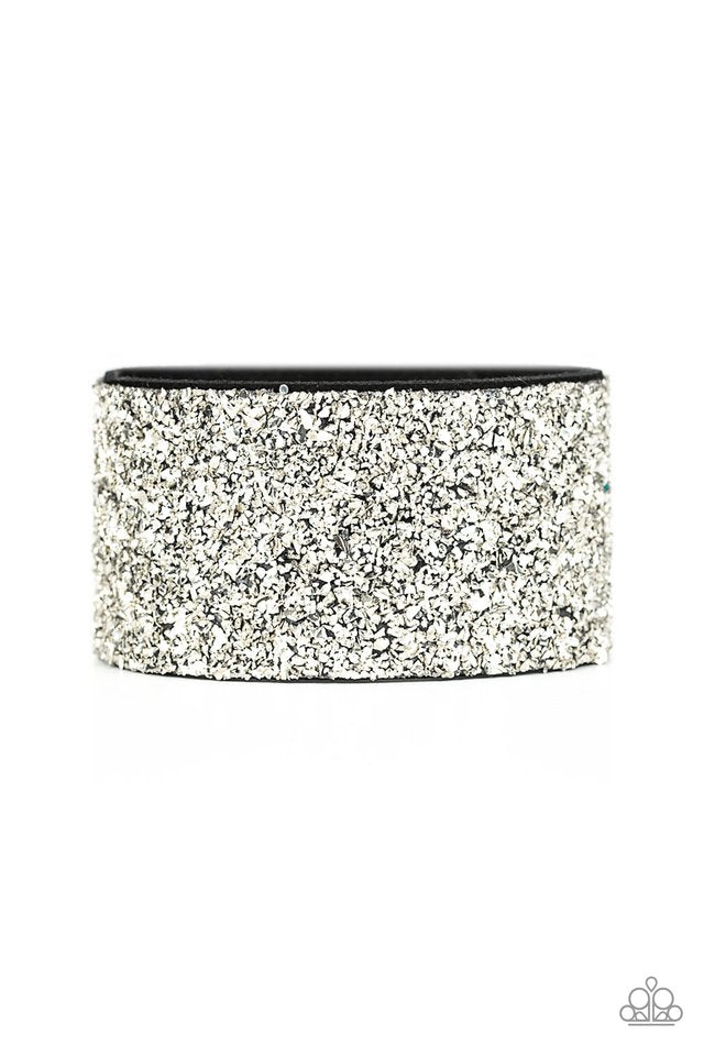 Crushed bits of silver accents are sprinkled along the center of a thick black suede band, creating a blinding shimmer around the wrist. Features an adjustable snap closure.