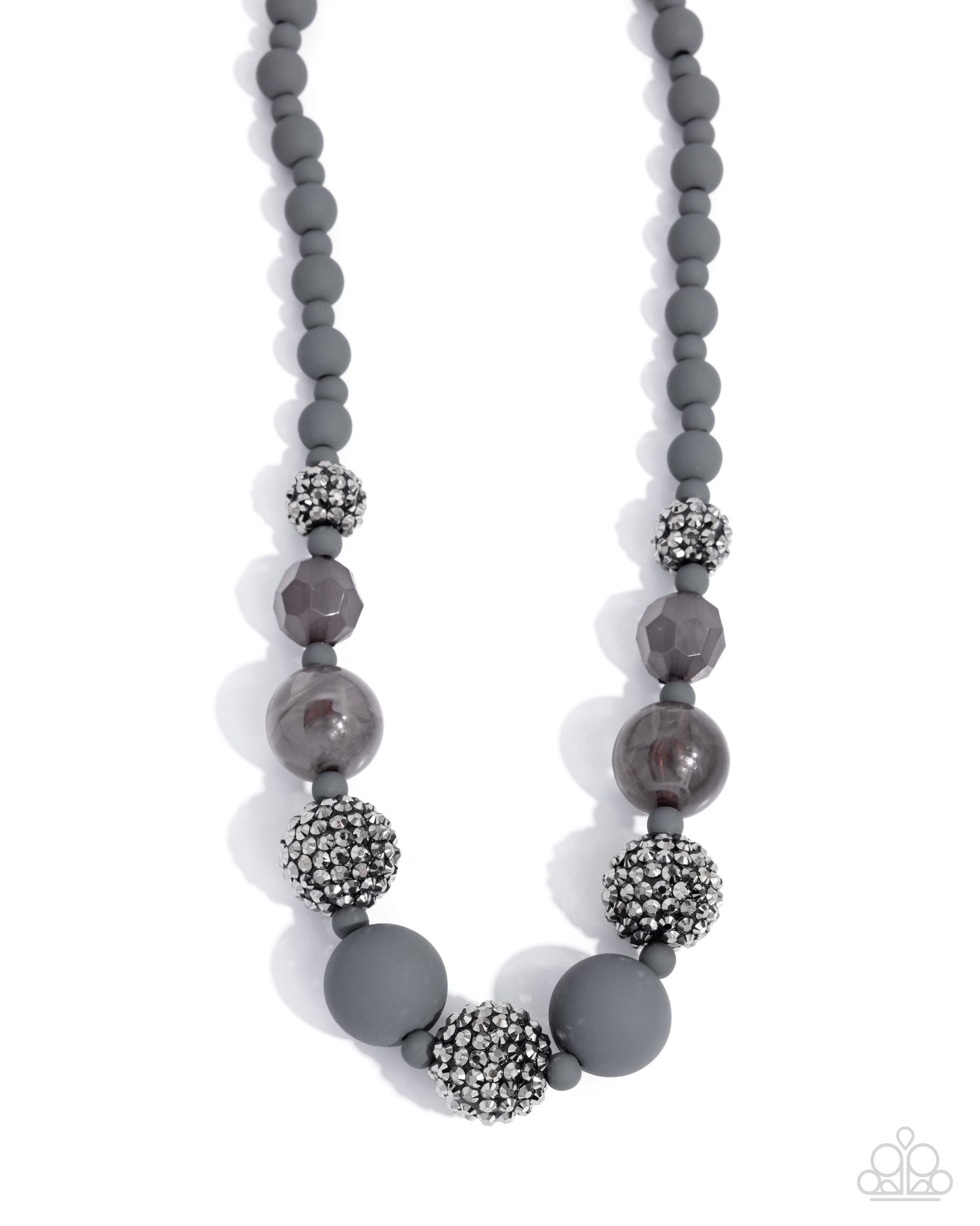 A blend of matte gray beads, faceted smoky accents, and oversized marbled gray beads is interspersed with dazzling hematite-encrusted spheres along the neckline. Features an adjustable clasp closure.