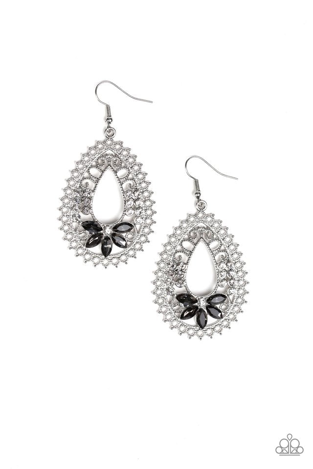 Studded filigree swirls into a frilly teardrop frame. Infused with glassy white rhinestones, smoky marquise-shaped rhinestones are pressed into a whimsical floral shape for a refined flair. Earring attaches to a standard fishhook fitting.