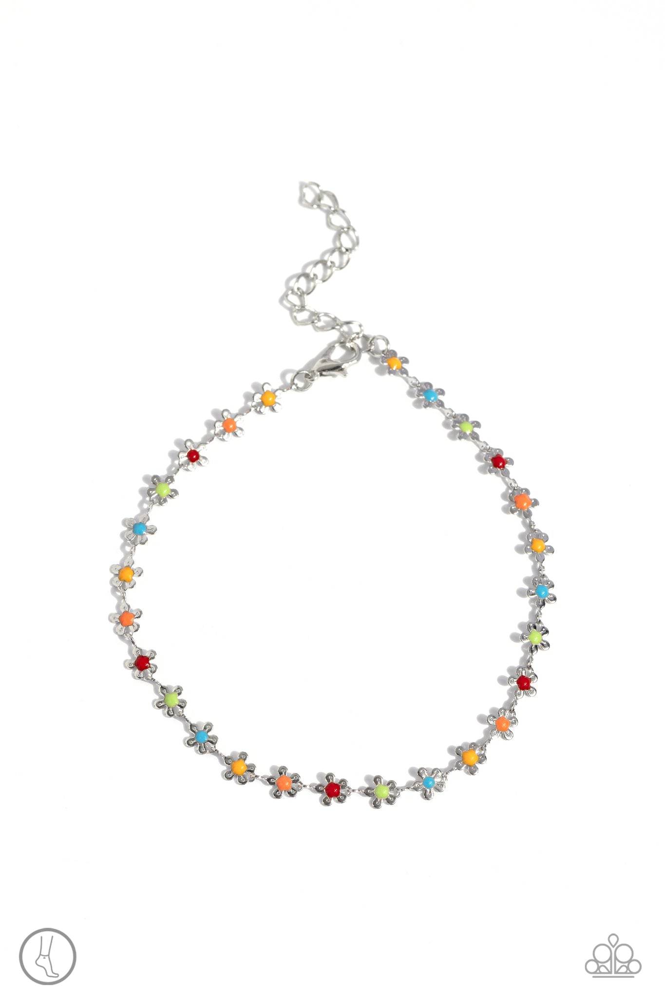 Featuring apple green, turquoise, Primrose, orange, and red centers, dainty silver daisies connect around the ankle for a whimsical pop of color. Features an adjustable clasp closure.