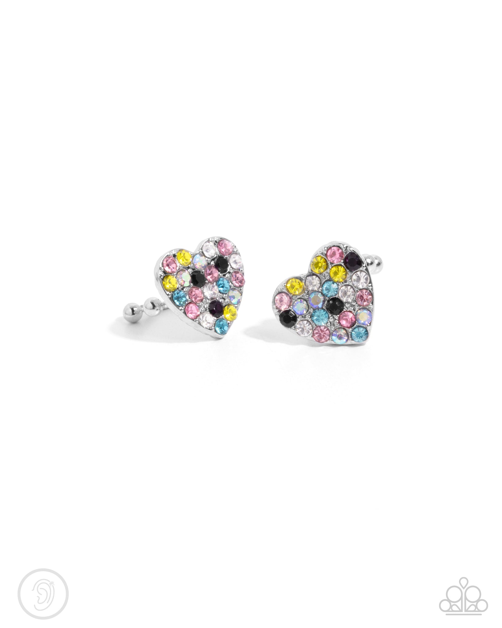 Embellished in multicolored and iridescent rhinestones, a silver heart curls around the ear for a heartfelt, one-size-fits-all cuff. Due to its prismatic palette, color may vary.