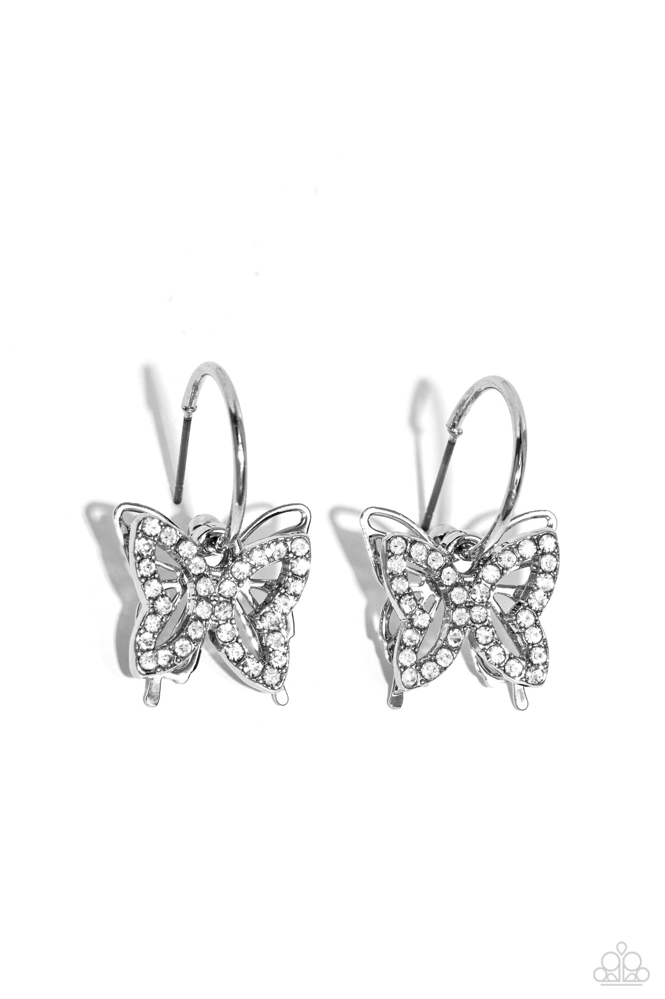 A small, skinny, shiny silver hoop curves around the ear in a timeless fashion. A shiny silver ball is affixed to the end of the hoop, reminiscent of a barbell fitting. A white rhinestone-encrusted butterfly frame, layered in front of a shiny silver airy butterfly frame, slides along the curvature of the hoop, adding a whimsical hint of shimmery movement. Earring attaches to a standard post fitting. Hoop measures approximately 1/2" in diameter.