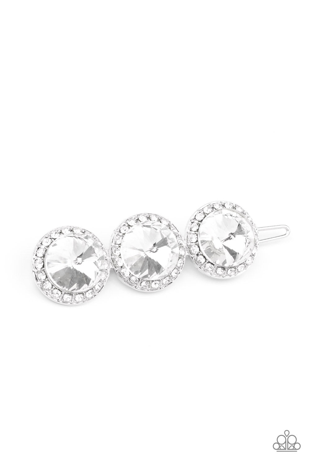 Encrusted in glassy white rhinestones, a trio of oversized white gems coalesce into a blinding centerpiece. Features a clamp barrette closure.